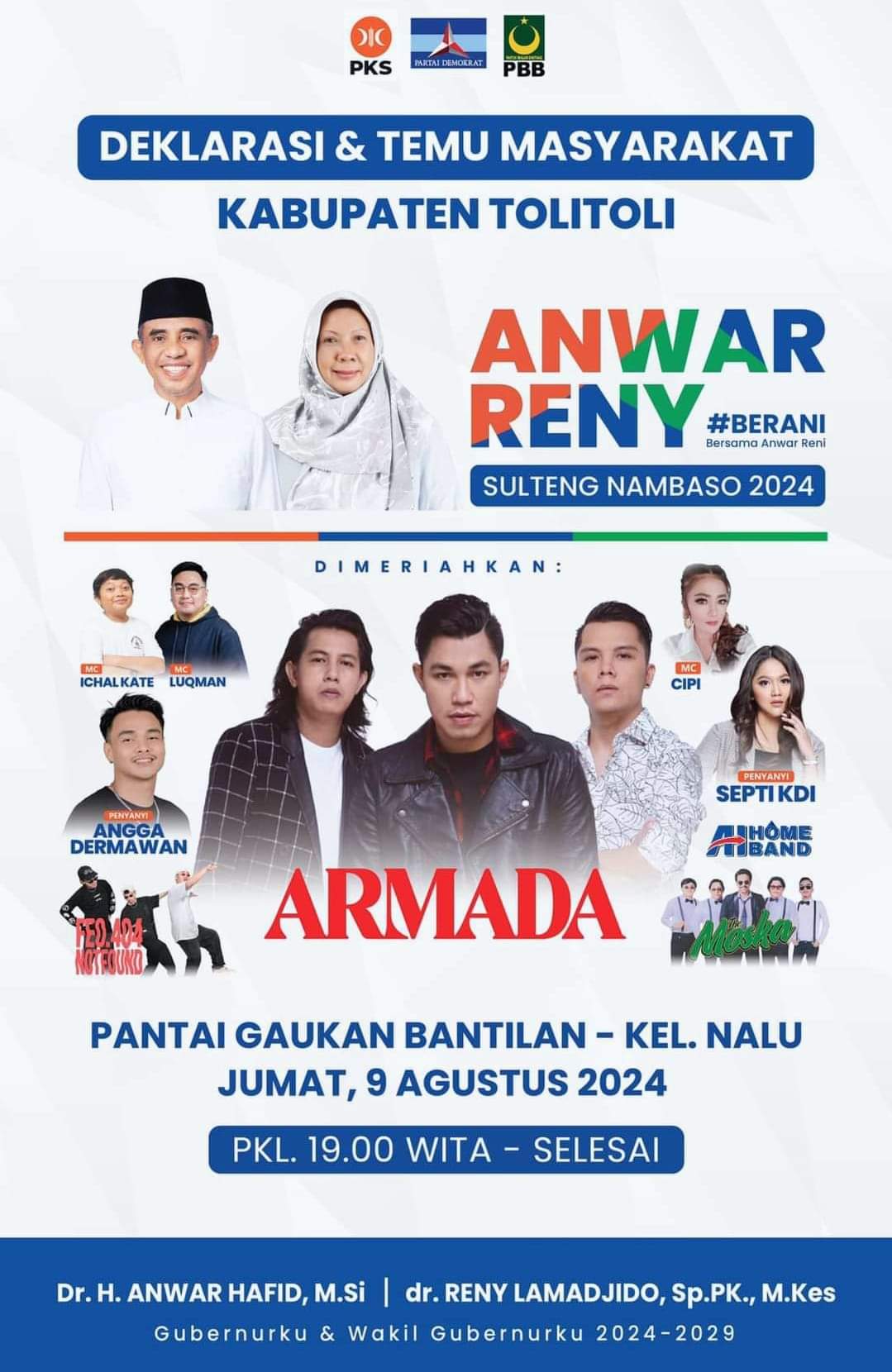 Deklarasi dan Tatap Muka ini bertujuan untuk memperkenalkan visi dan misi pasangan Bersama Anwar-Reny kepada masyarakat Sulawesi Tengah khususnya di kabupaten Tolitoli dengan menghadirkan Artis Ibu Kota ARMADA.