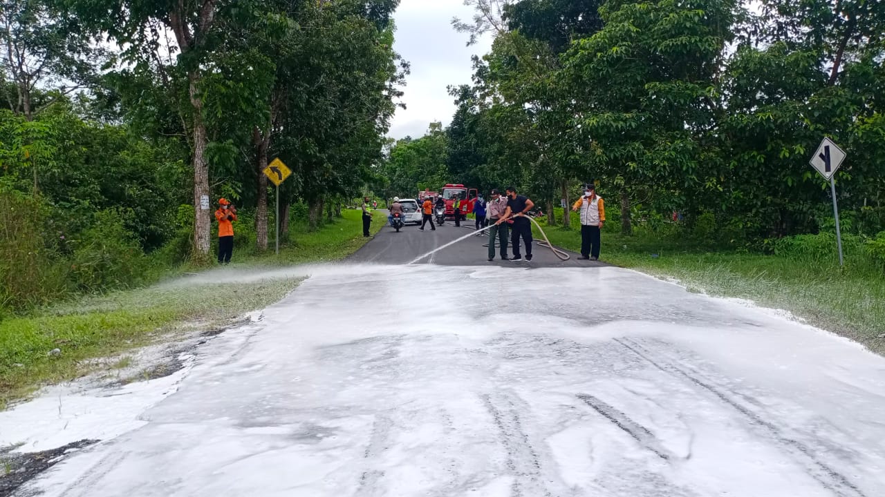 Dijelaskan Marto, dirinya mendapat informasi dari pengguna jalan, bahwa ada minyak yang berceceran di jalan Djanias Djangkan sekitar pukul 10.00 WIB. Kemudian pihaknya segera ke lokasi dengan 2 unit mobil Damkar untuk membersihkan sisa tumpahan BBM yang mengakibatkan belasan orang terjatuh.