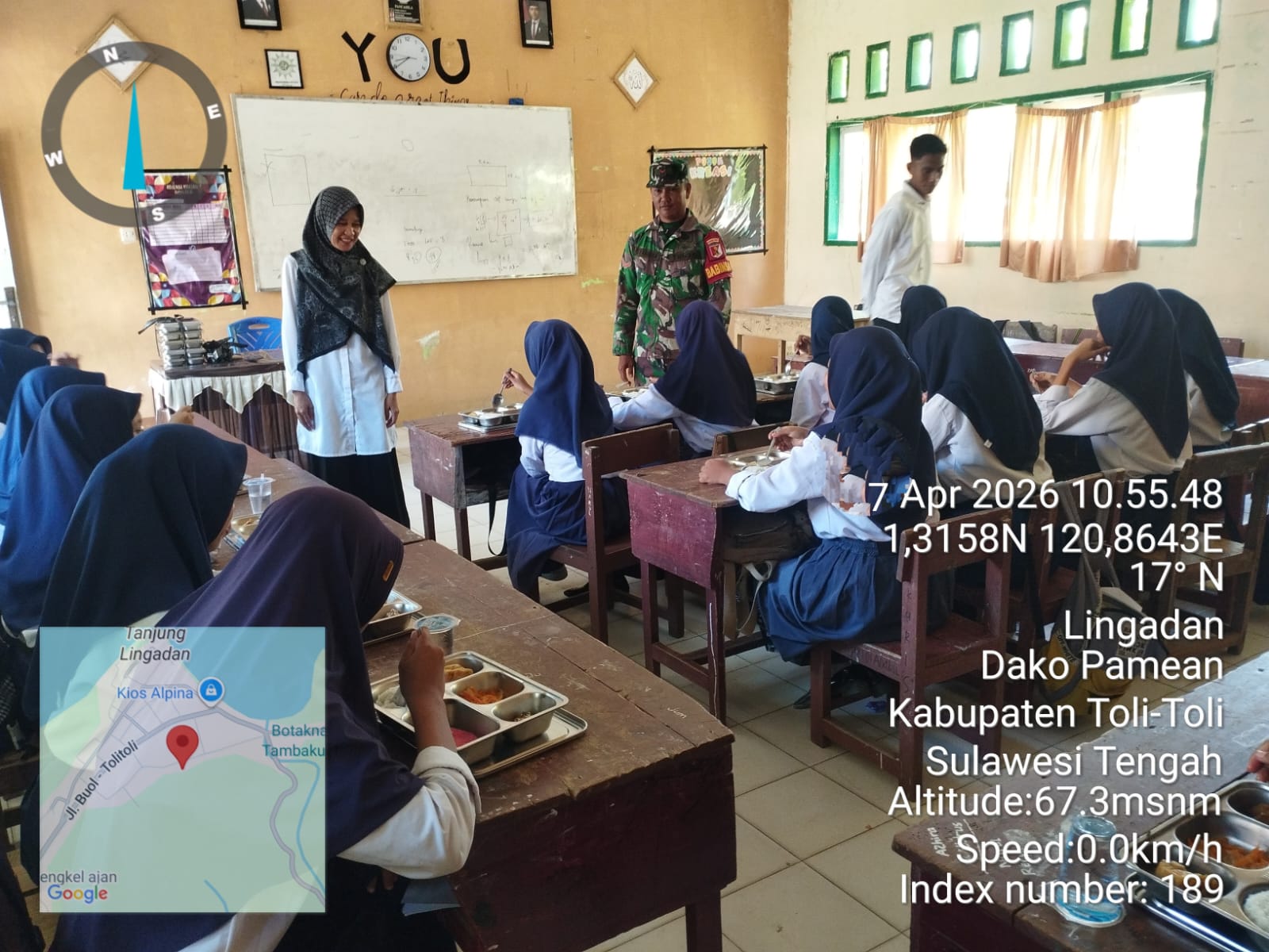 Kegiatan ini berlangsung di wilayah Desa Dungingis, tepatnya di Jl. Trans Sulawesi, Kecamatan Dakopamean, Kabupaten Tolitoli, sebagai pusat operasional SPPG. Dalam pelaksanaannya, peran langsung Babinsa turut terlihat dalam memastikan kegiatan berjalan tertib, aman, dan tepat sasaran.