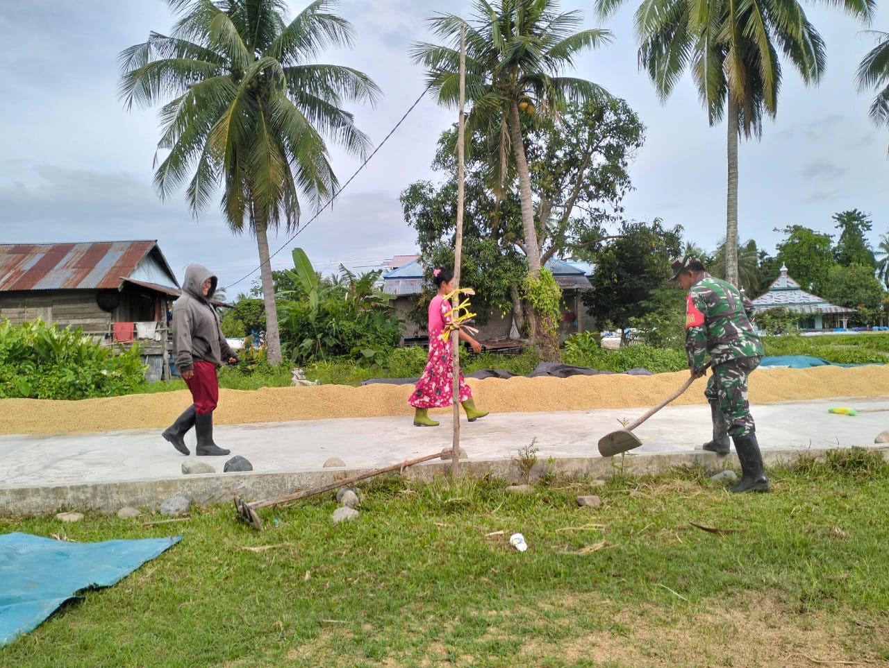 Kegiatan tersebut difokuskan pada proses penjemuran padi jenis Mekongga milik Ibu Surti, yang merupakan salah satu tahapan penting pascapanen guna menjaga kualitas gabah sebelum memasuki proses penggilingan. Di tengah teriknya matahari, Serma Herman turut terlibat langsung di lokasi penjemuran, memastikan proses berjalan optimal sehingga hasil panen tetap terjaga mutunya.