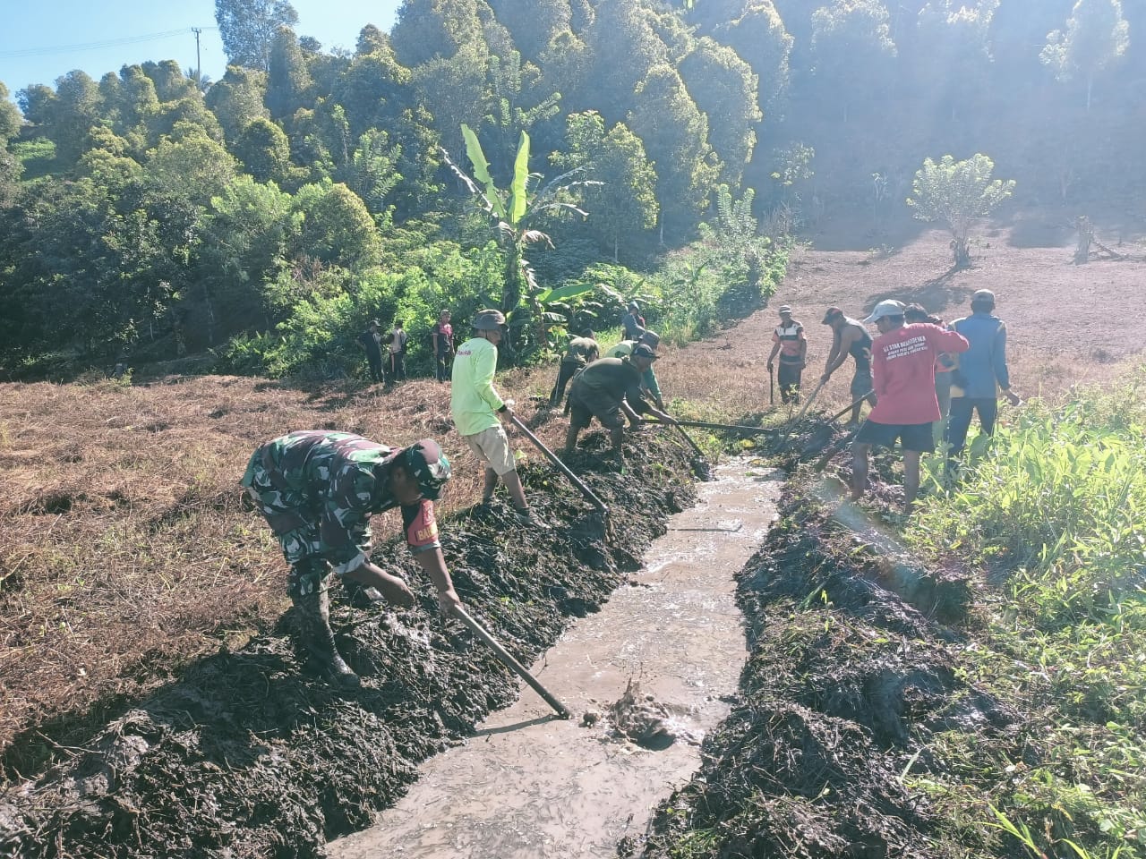 Gotong royong tersebut dilakukan sebagai bentuk kepedulian Babinsa terhadap peningkatan produktivitas pertanian di wilayah binaannya. Saluran irigasi yang selama ini mengalami pendangkalan dan tersumbat akibat lama tidak digunakan, kini mulai dibersihkan dan digali kembali agar dapat berfungsi optimal untuk mengairi lahan pertanian warga.