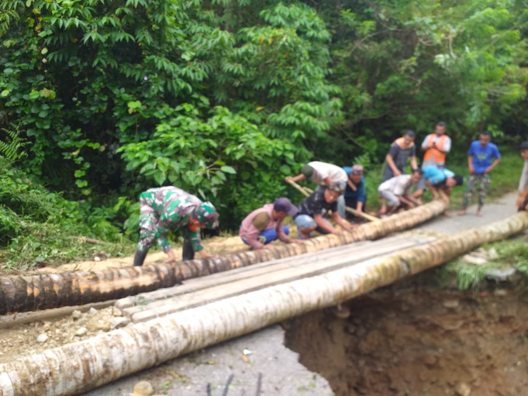 Akibat kejadian tersebut Babinsa Koramil 1305-04/Dondo Serda Endri Susanto bersama masyarakat bergerak cepat membuat jembatan darurat, Selasa (04/04/2023).