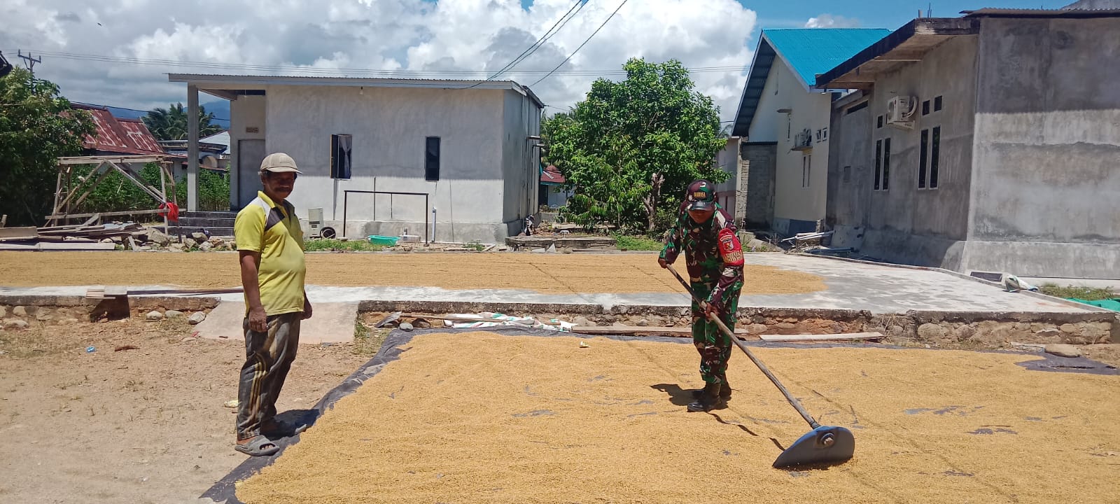 Tolitoli — Anggota Koramil 1305-04/Dondo, Koptu Muh. Husni, melaksanakan kegiatan Hanpangan di Dusun Gonggol, Desa Tinabogan, Kecamatan Dondo, Kabupaten Tolitoli. Kegiatan tersebut dilaksanakan bersama warga setempat, khususnya Bapak Sapar, dalam proses penjemuran padi jenis Migongga usai masa panen. Rabu, 29/04/26.