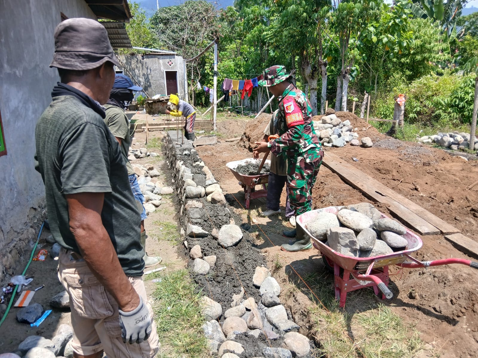 Di lokasi kegiatan, Praka Elianton bersama masyarakat bahu-membahu menyiapkan material bangunan seperti pasir, batu, semen, dan air sebelum proses pengecoran pondasi dilaksanakan. Seluruh pekerjaan dikerjakan secara kompak sehingga kegiatan berjalan lancar dan tertib.