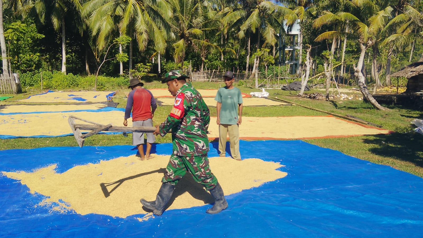 Dalam kegiatan tersebut, Koptu Moh. Syarif turut terjun langsung ke lokasi pertanian milik warga, yakni lahan milik Bapak Uling. Di tengah suasana kebersamaan, ia berpartisipasi dalam proses penjemuran padi hasil panen yang menjadi salah satu tahapan penting untuk menjaga kualitas gabah sebelum masuk ke proses pengolahan lebih lanjut.