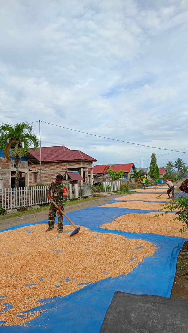 Dalam kegiatan tersebut, Serda Kosmas D. Dewa turun langsung ke lokasi pertanian milik Bapak Baso untuk melaksanakan penjemuran jagung hasil panen.