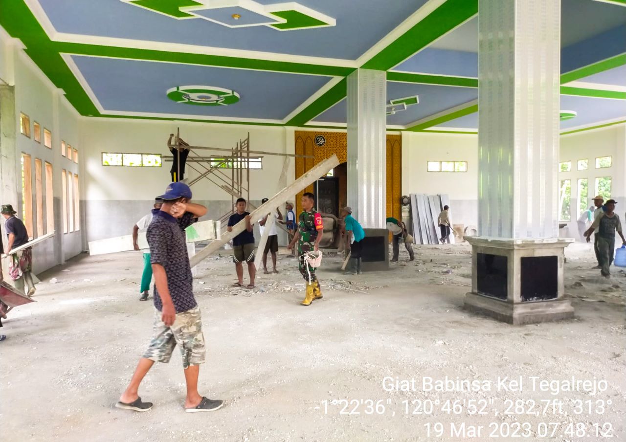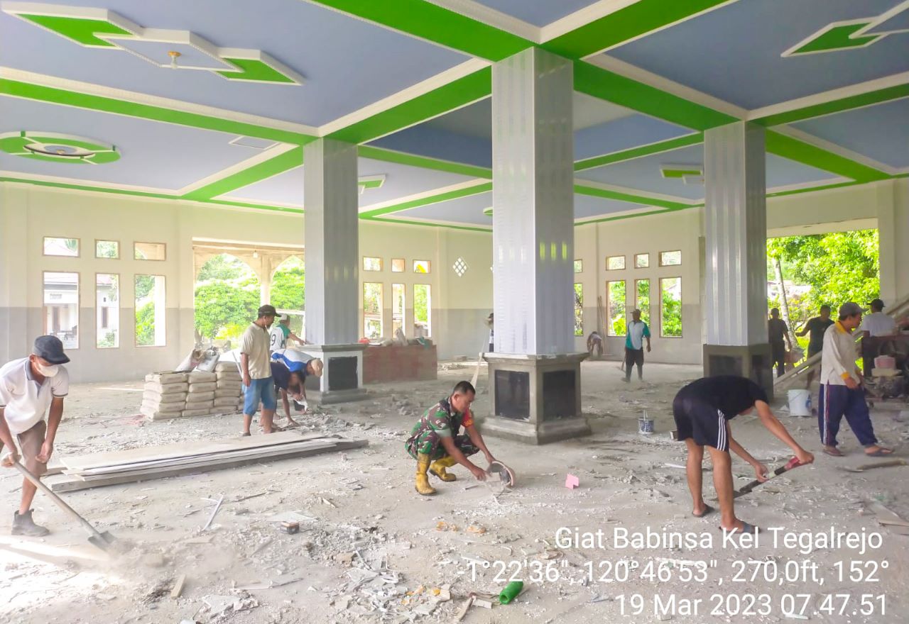 Poso, Sulteng | kabartoday.id – Babinsa Serka Ngadimn Ahmad Diharjo, bersama warga binaan Kelurahan Tegalrejo bergotong royong melaksanakan kegiatan membantu pemasangan keramik didalam Masjid Al-Hidayah, Minggu (19/03/2023).