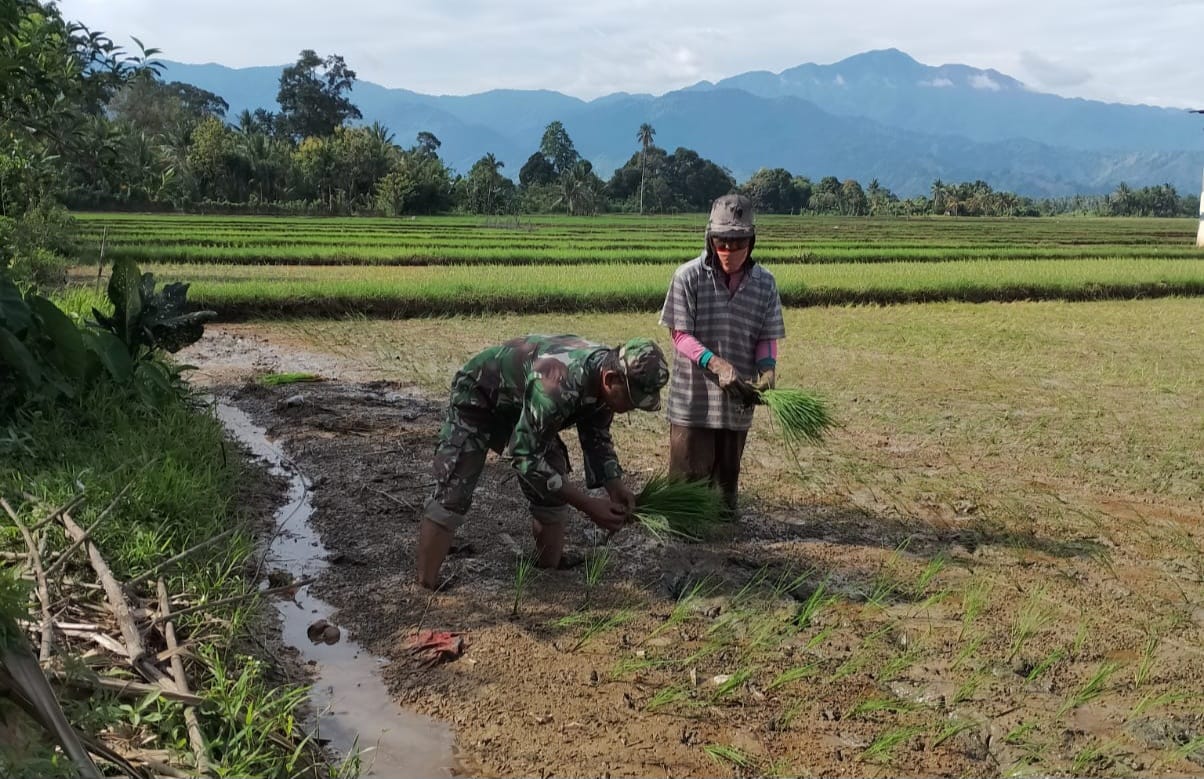 Babinsa Stadong Koramil 1305-03/Dampal Utara Turun ke Sawah Bantu Tanam Padi