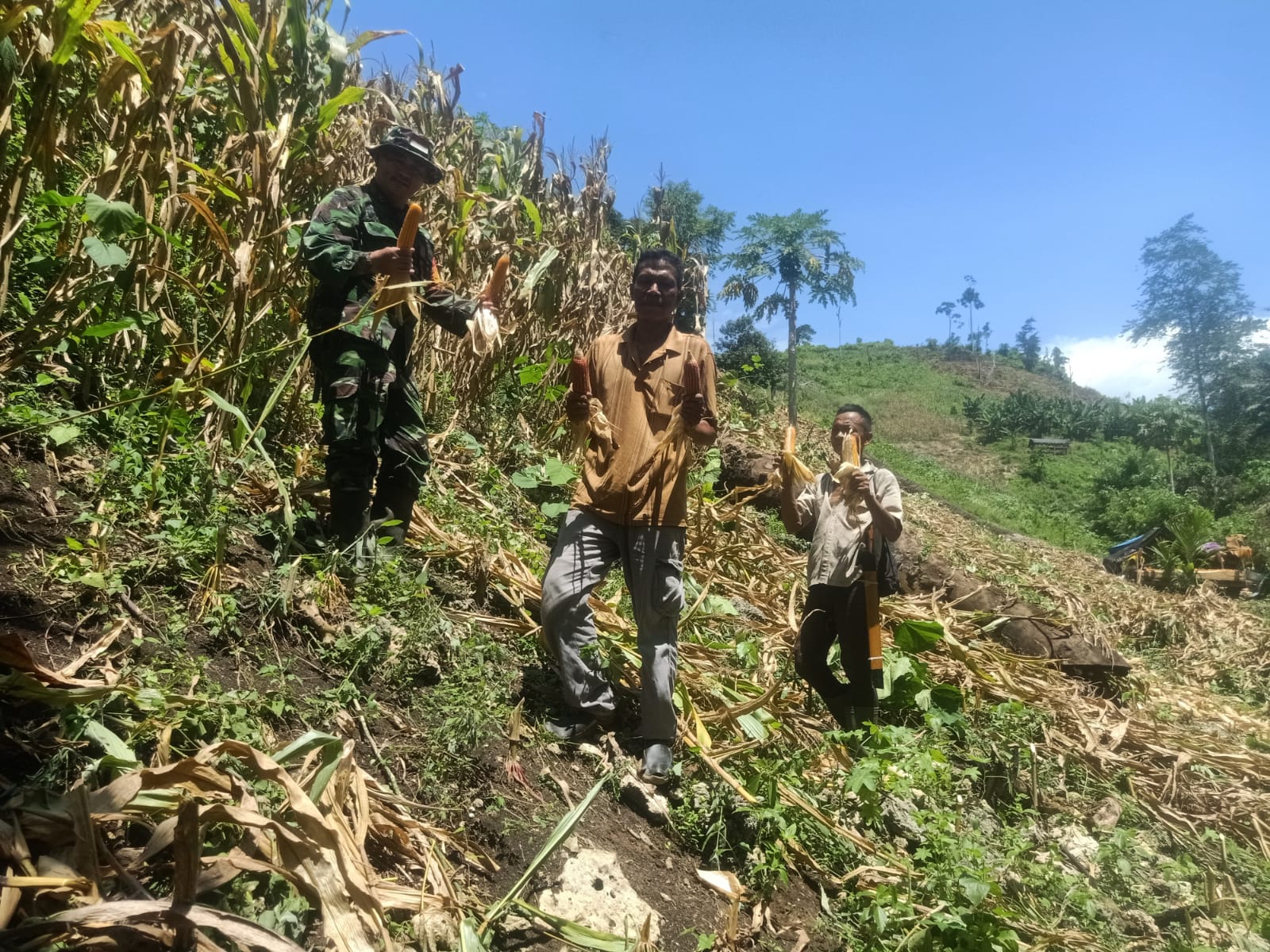 Kodim1305/BT, Sulteng | Kabartoday.id – Dalam rangka mendorong semangat kebersamaan antara TNI dan Rakyat juga untuk menghidupkan kembali rasa kebangsaan, Personil Koramil 1305-09/Bokat Serda Moudy Kaloh membantu petani memanen jagung.