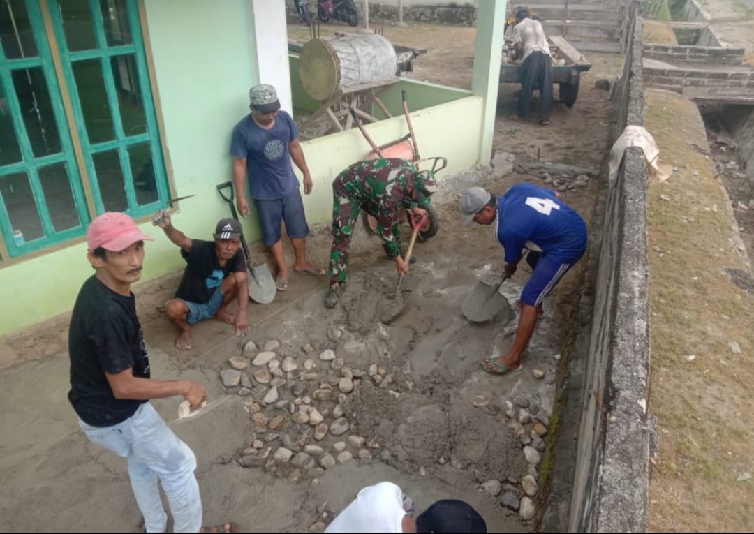 Bantu Pengecoran Teras Masjid, Babinsa Kopda Amran Nasrul Berbaur Dengan Masyarakat