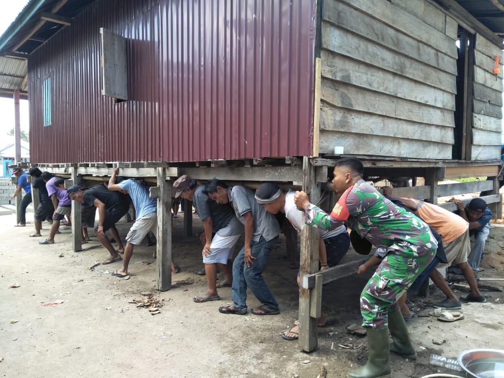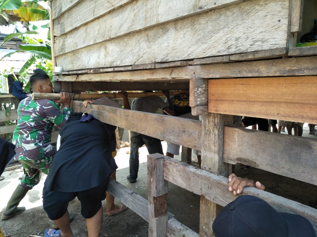 Seperti yang dilakukan Personel Koramil 1305-04/Dondo, Babinsa Desa Malala Praka Shokhif ikut bergabung “Berbaur” dengan masyarakat untuk membantu mengangkat rumah milik warga “Ibu Darsih” yang akan di pindahkan.