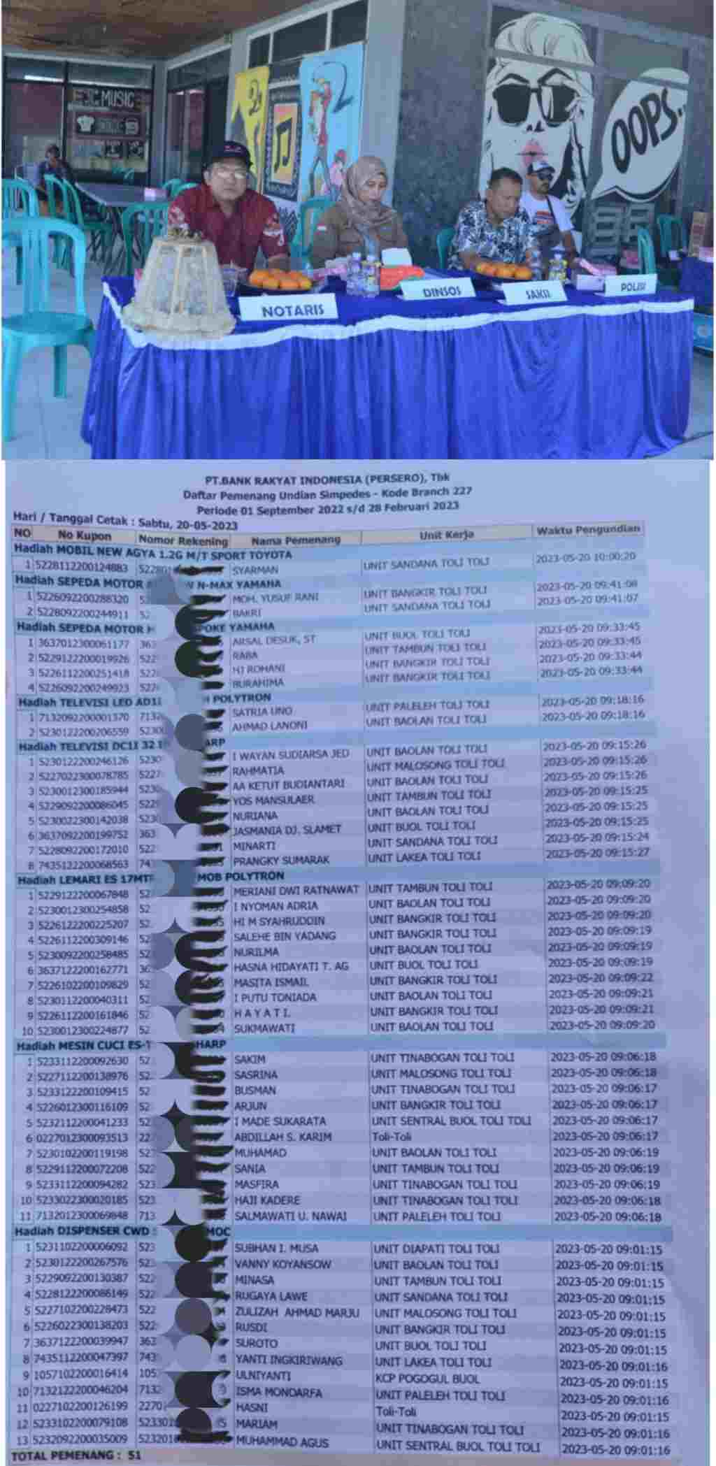 Sementara itu dalam undian Panen hadiah Simpedes Periode ke 2 tahun 2023 Hadiah Grand prize (Toyota New Agya 1.2 G M/T Sport), Hadian utama 1 (Yamaha All New N-Max), Hadiah Utama 2 (Yamaha Mio M3 Spoke), Hadiah Biasa I ( TV Polytron LED 50.Inci, hadia Biasa III ( Tv Sharp 32 inchi) Hadiah Biasa IV ( Lemari es Polytron 17MTR/Mow /Mob), Hadiah Biasa V (Mesin cuci Sharp Es- T 80 Mw, dan hadiah hiburan Dispenser Kosmos CWD 5603.