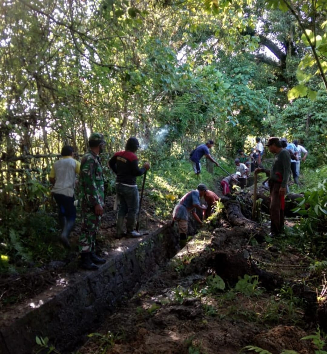Kegiatan karya bakti ini melihat kondisi parit yang sudah tertutup rumput liar dan sampah, kondisi tersebutlah yang mendorong Babinsa bersama kepala desa dan masyarakat untuk mengisi waktu luang dengan bergotong royong membersihkan saluran utama baik itu mengangkat sampah maupun rumput liar yang tumbuh di saluran air.