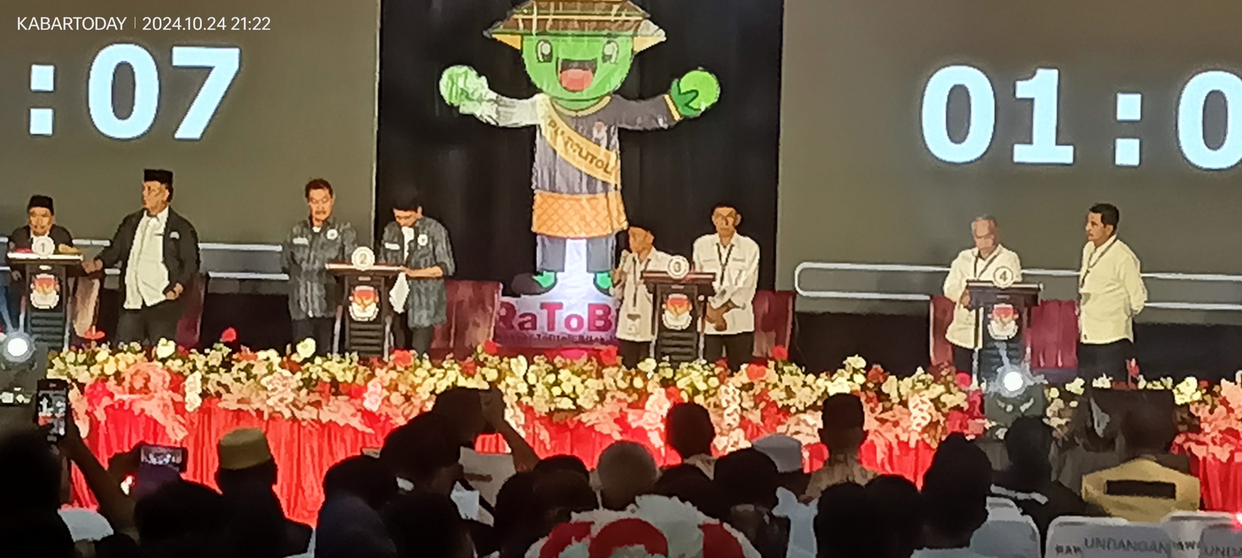 Hadir didalam Debat Publik Perdana, Paslon Bupati dan Wakil Bupati nomor urut 01,02, 03, dan 04, Tim Pemenangan keempat Paslon, Ketua KPU Tolitoli didampingi Anggota Komisioner KPU, Sekretaris KPU Tolitoli dan jajarannya, KPU Kabupaten Tolitoli, PJ Bupati Tolitoli, Bawaslu Tolitoli , Kapolres, Dandim, Kajari, Kaban Kesbangpol, Moderator , Pinalis, Simpatisan keempat Paslon dan Insan Pers. ***