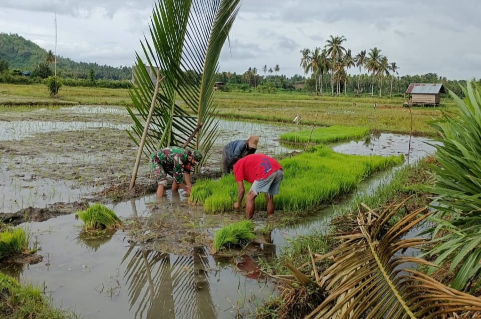 Dengan Penuh Semangat Babinsa Koramil 1305-07/Bunobogu Bantu Petani Cabut Bibit Padi