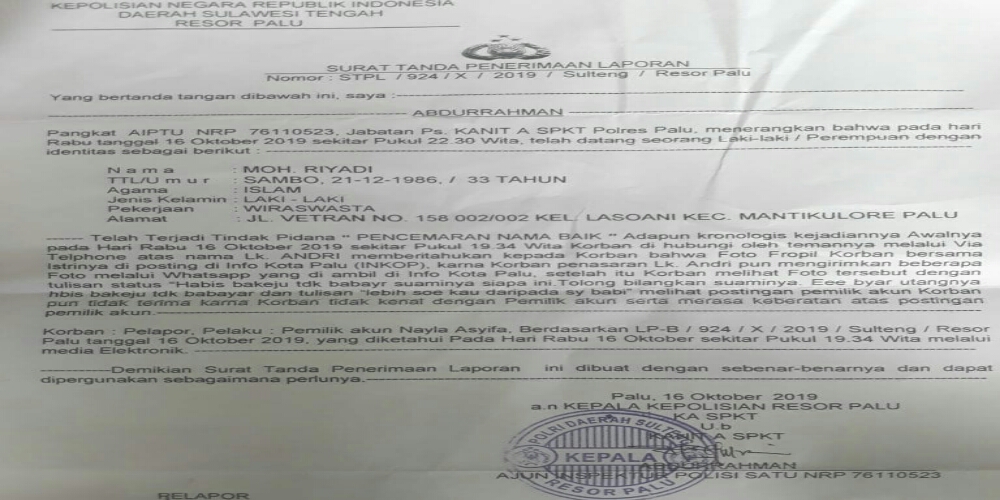 Dalam laporan polisi STPL /924 /X/2019 /Sulteng/Resor Palu Tanggal 16 Oktober 2019 disebutkan, korban pencemaran nama baik bernama Moh. Riyadi yang melaporkan pemilik akun Nayla Asyifa, karena memposting foto profilnya yang dichapture dari akun facebook pribadi Moh. Riyadi.
