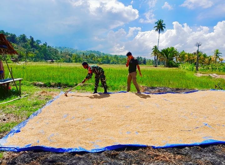 Dukung Ketahanan Pangan, Babinsa Koramil 1305-09/Bokat Bantu Petani Jemur Padi