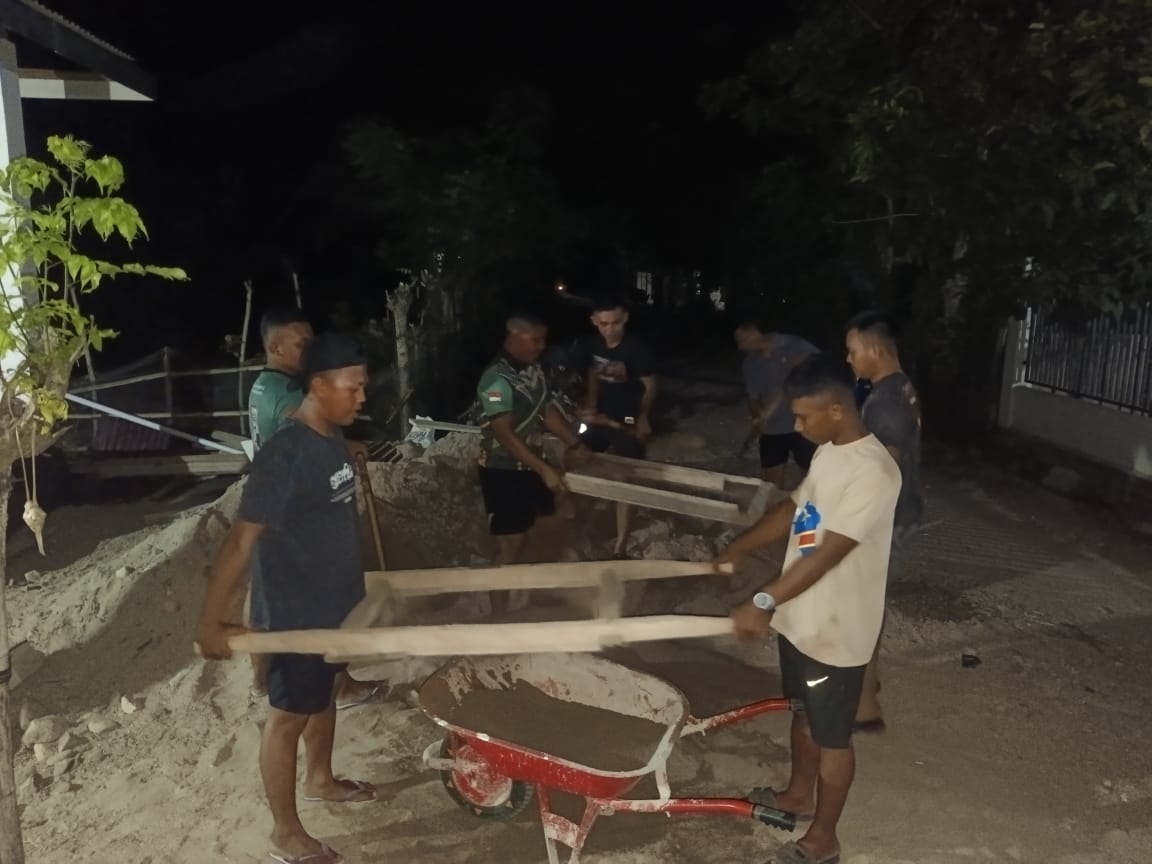 Hanya dengan berbekal sinar lampu, dan gelapnya malam tak menyurutkan semangat anggota satgas dalam melaksanakan percepatan Pembagunan Mushola “menyaring Pasir” untuk memberikan hasil yang maksimal dan bisa selesai pada waktunya.