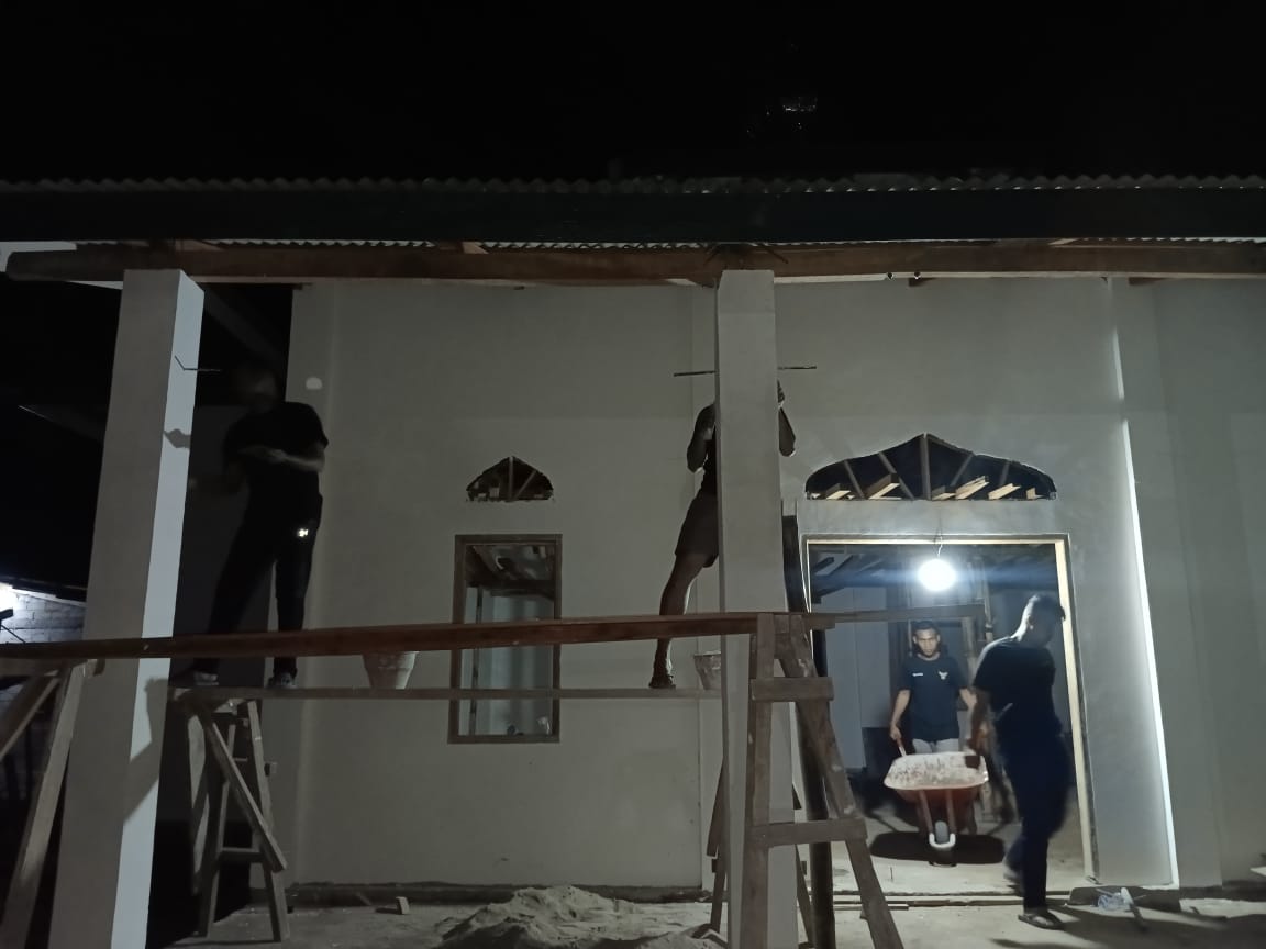 Bangunan Mushola yang dibangun dari Nol dan kini sudah masuk tahap pemasangan Keramik, Plafon dan pengecetan hingga hari ke 22 TMMD 118 Kodim 1305/BT untuk mengejar target waktu yang tinggal 6 hari lagi maka di perlukan kerja lembur malam hari.