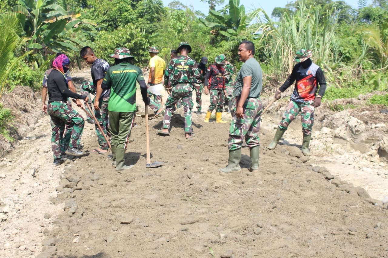 “1 truk timbunan yang akan dihampar tidak membutuhkan waktu lama, dimana warga sangat antusias membantu dengan mengunakan alat manual,” ujar pasi Ter Kodim 1305/BT.