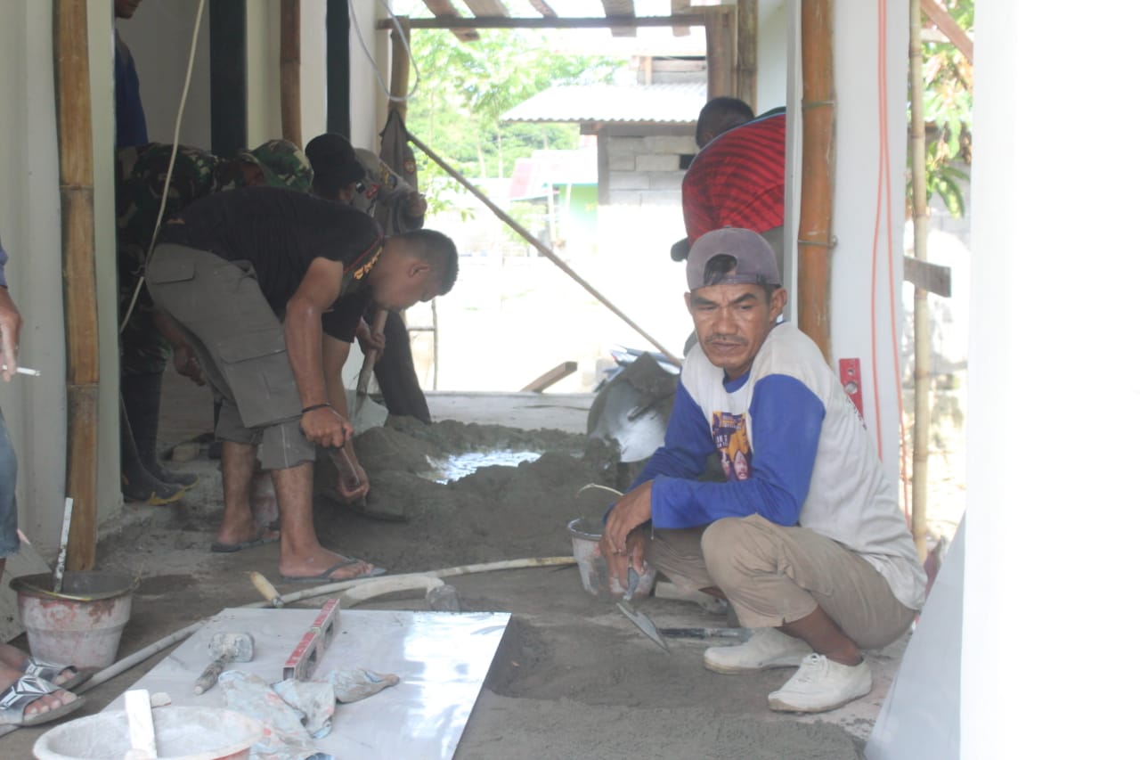 Dari awal pembangunan hingga saat ini pada tahap pemasangan keramik lantai dan plester dinding, anggota Satgas dan masyarakat setempat kompak saling bekerjasama, agar hasil pekerjaan yang dicapai bisa lebih maksimal.