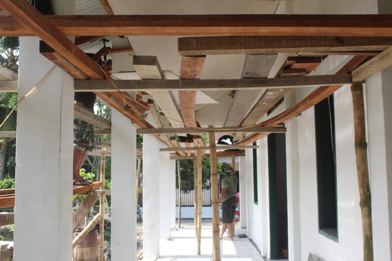 “Tinggal 10 persen saja pekerjaan yang tersisa dalam pembagunan Mushola, mulai dari Plafon, Jendela Pintu, dan pemasangan keramik teras Mushola. Insyallah sore ini pemasangan Keramik teras dipastikan sudah selesai,” jelas Letda Inf Suyadi.