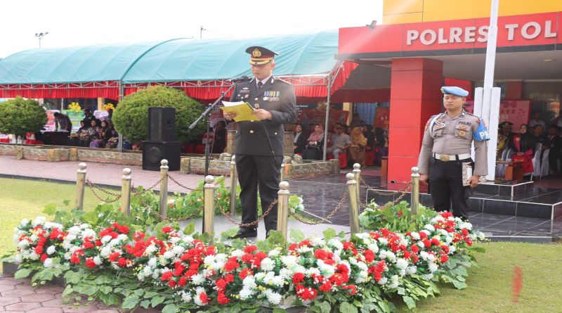 Kapolres Tolitoli AKBP Bambang Herkamto, SH., MH. saat membacakan sambutan Kapolda Sulteng menyampaikan makna dari tema Peringatan Hari Bhayangkara ke-78 Tahun 2024 “Polri Presisi Mendukung Percepatan Transformasi Ekonomi Yang Inklusif dan Berkelanjutan Menuju Indonesia Emas.”