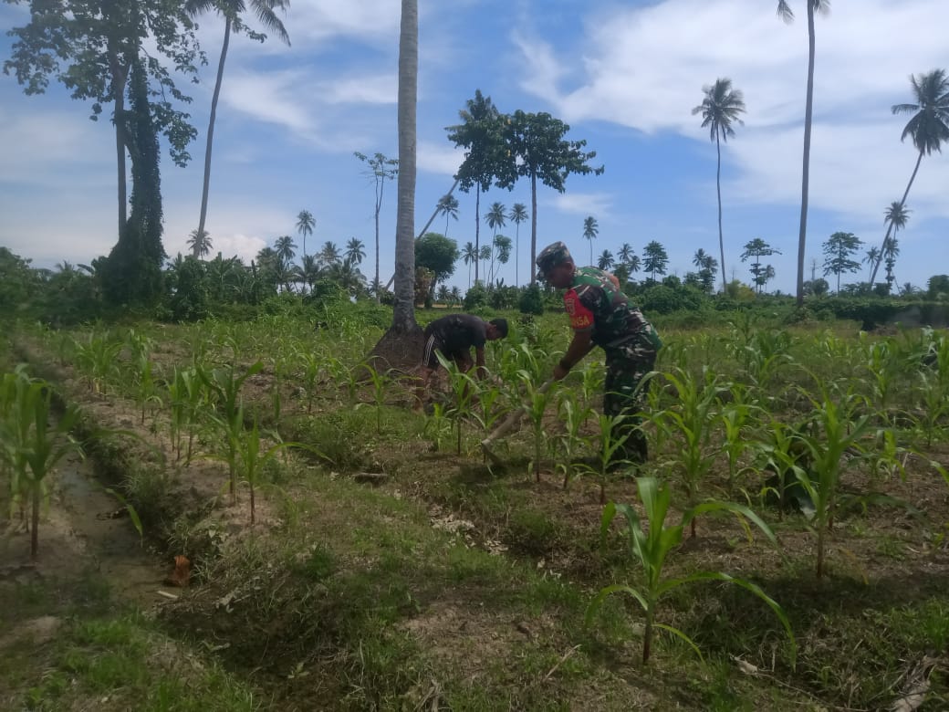 Jaga Pertumbuhan Tanaman Jagung, Babinsa Koramil 1305-01/Baolan Bantu Bersihkan Rumput