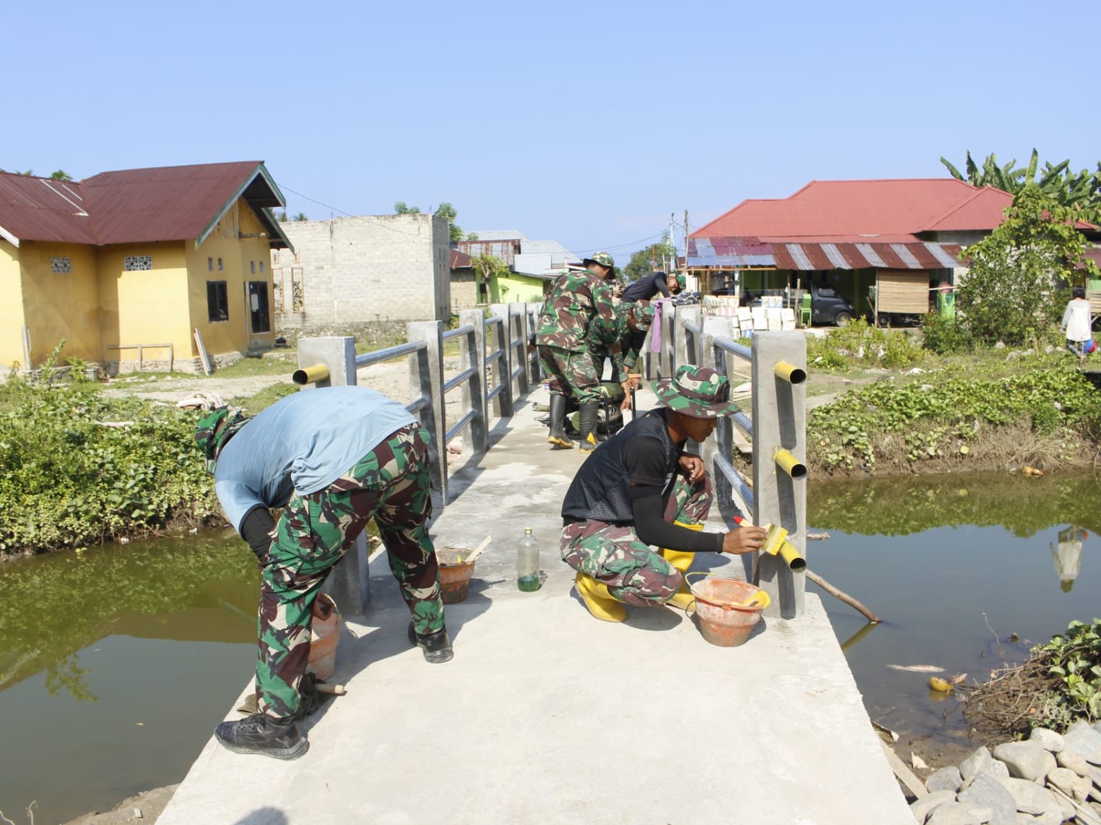 Hari ini Minggu warga bersama Satgas TMMD terus mengecat jembatan yang dibangun lewat program TMMD ke-118 Kodim 1305/BT.