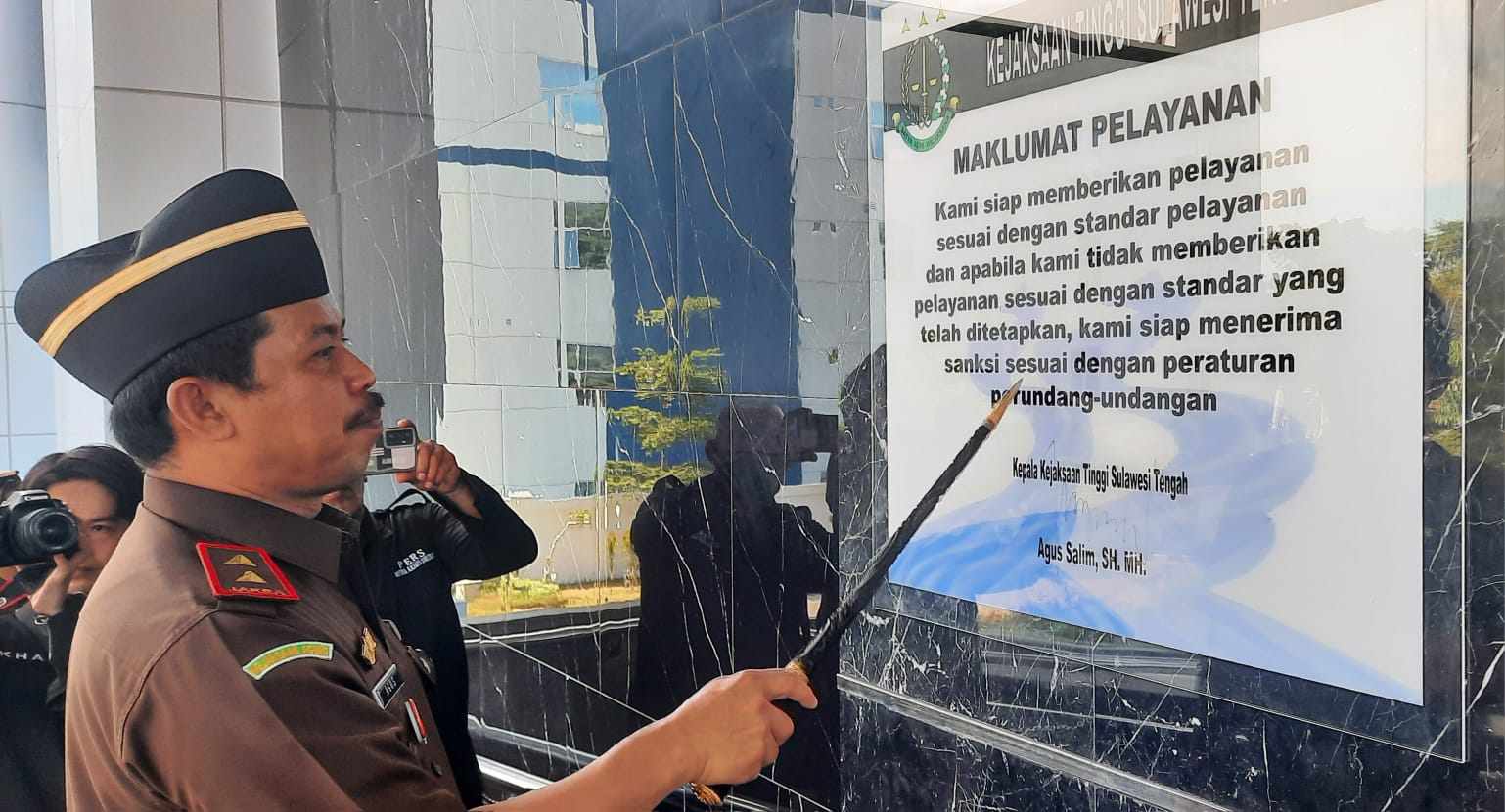 “Kami siap memberikan pelayanan sesuai dengan standar pelayanan dan apabila kami tidak memberikan pelayanan sesuai dengan standar yang telah ditetapkan, kami siap menerima sanksi sesuai dengan peraturan perundang-undangan,” ujar Kajati Sulteng.