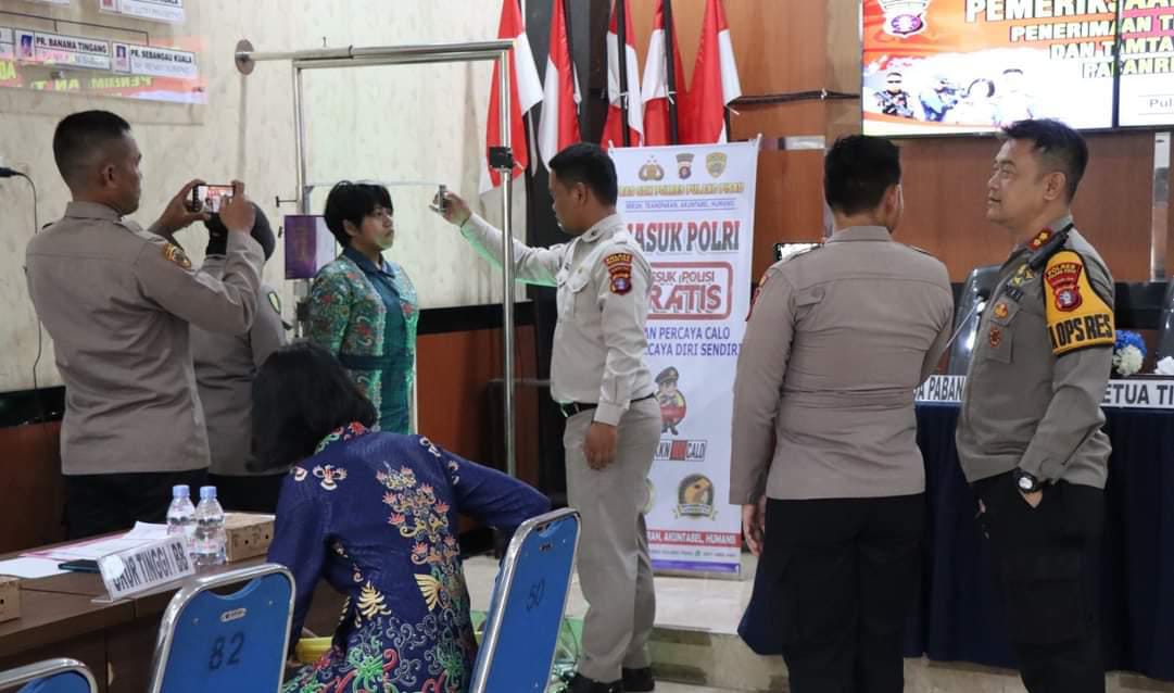 Saat menyaksikan proses verifikasi dan pemeriksaan administrasi awal penerimaan anggota Polri TA 2024 di Polres Pulang Pisau, Rabu (24/04/2024) sekira pukul 09.30 WIB, Kapolres Pulang Pisau didampingi Kabag SDM, AKP. Junedinoto, para pengawas internal serta pengawas eksternal.