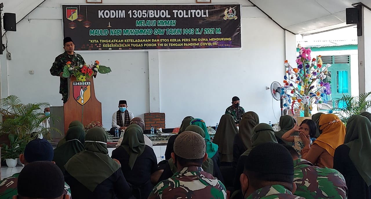Tolitoli, Sulteng | Kabartoday.com – Komando Distrik Militer (Kodim) 1305/BT Letkol Inf Farid Yudis Purwanto melaksanakan kegiatan peringatan Maulid Nabi Muhammad SAW Tahun 1443 H/2021 M. Bertempat di Aula Serba Guna Kodim 1305/BT Jalan Magamu Kelurahan Tuweley Kecamatan Baolan Kabupaten Tolitoli, Selasa (26/10/2021).