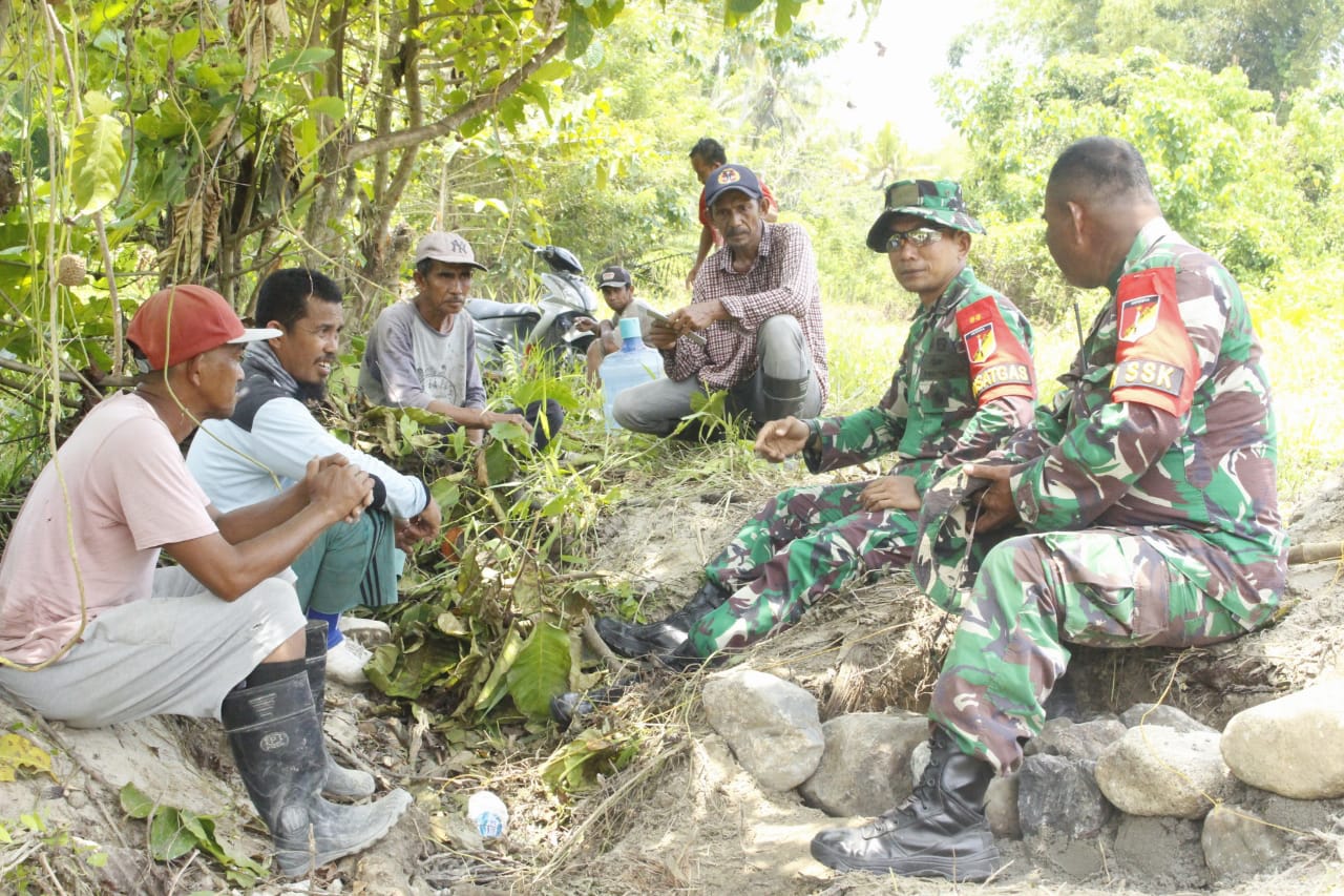 Dansatgas TMMD, Letkol Inf Dedi Akhiruddin S.A.P sedang duduk di atas tanah untuk berbicara dengan rakyat terkait kendala kendala serta pelayanan TNI selama pelaksanaan TMMD.