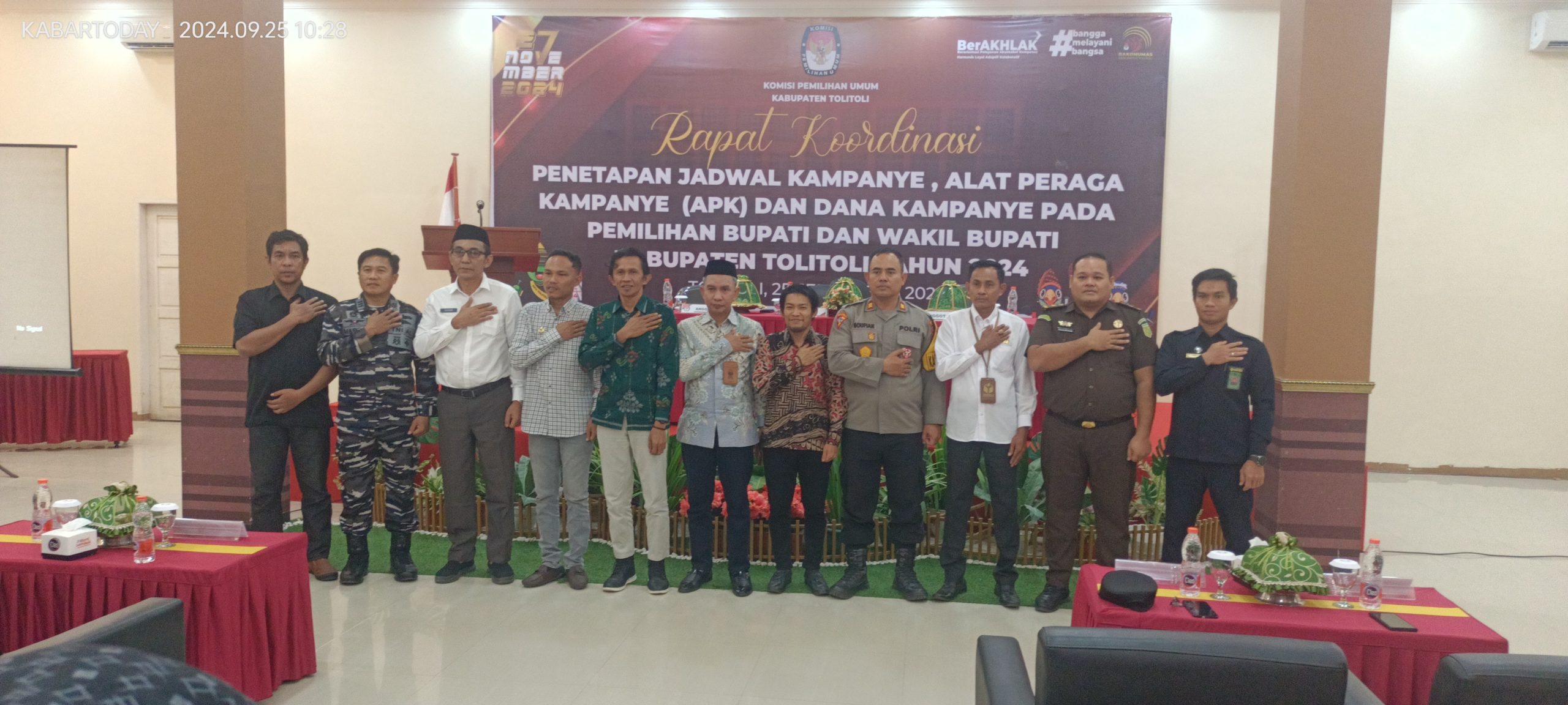Rakor tersebut di selenggarakan di Hotel Mitra Utama, Rabu (25/09/2024) Pagi di buka langsung Ketua KPU Tolitoli Junaidi yang didampingi oleh Divisi Teknis Rian Virvian Hidayat, Delivisi Parmas Warman Maulana, Divisi Hukum Marzuki, dan turut dihadiri Kepala dinas Lingkungan Hidup Kabupaten Tolitoli Ridwan SH, Kepala Dinas Kominfo Tolitoli, Kasat Pol PP kabupaten Tolitoli, Kapolres Tolitoli yang di wakili Kasat Intelkam Polres Tolitoli AKP Army, Kepala kejaksaan Negeri Tolitoli yang di wakili, Dandim 1035/BT yang di wakili, Danlanal Tolitoli yang di wakili, Bupati Tolitoli yang di wakili Asisten 1, LO Pasangan Calon, Tim Sukses Pasangan Calon, kuasa hukum pasangan Calon dan Awak media serta tamu undangan.