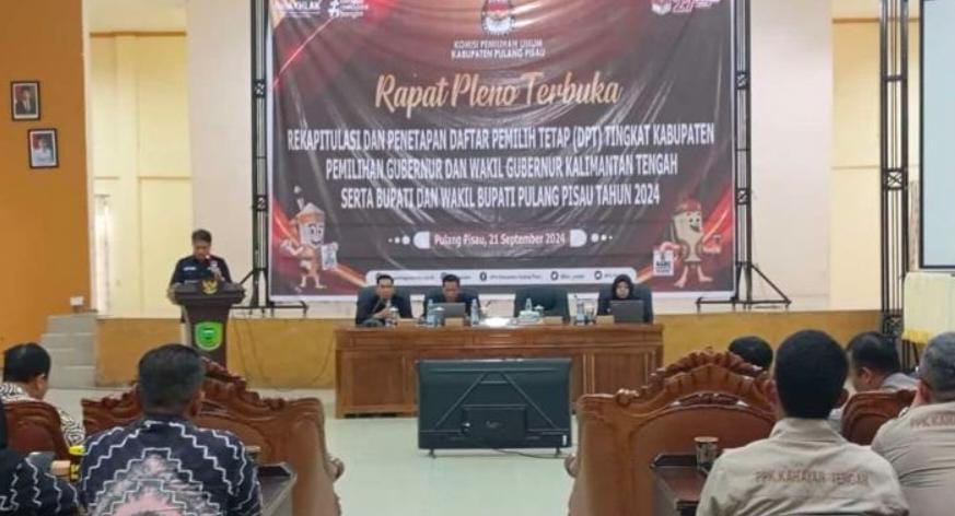 SUYANTO | PULANG PISAU | KALTENG – Komisi Pemilihan Umum (KPU) Kabupaten Pulang Pisau menggelar Rapat Pleno Terbuka Rekapitulasi dan Penetapan Daftar Pemilih Tetap (DPT) pemilihan Gubernur dan Wakil Gubernur Kalimantan Tengah serta Bupati dan Wakil Bupati Pulang Pisau Tahun 2024, di Aula Bapperida Kabupaten setempat, Sabtu, (21/09/2024).