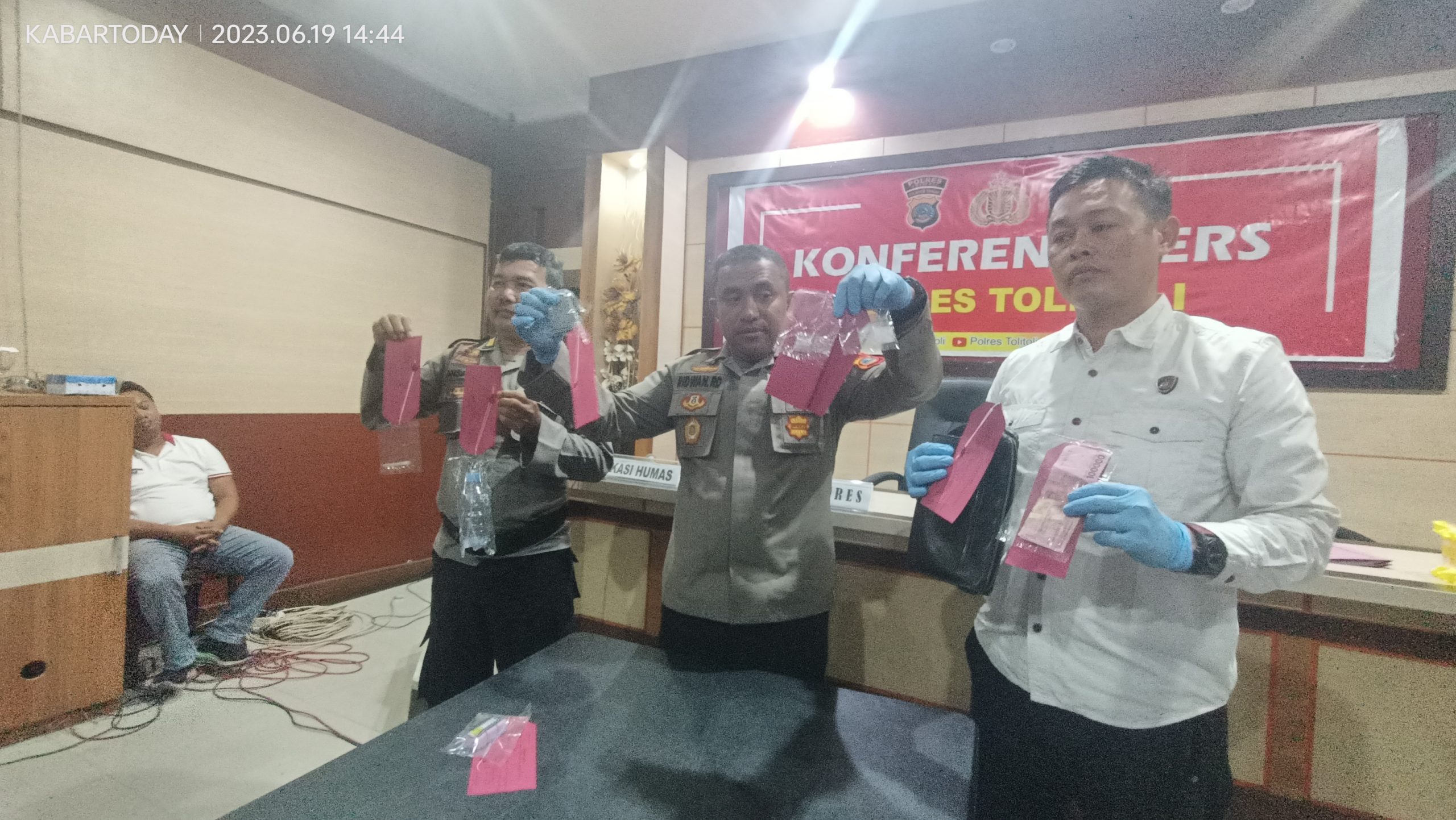 Dalam press Rilis yang di gelar Polres Tolitoli yang dipimpin langsung Kapolres Tolitoli AKBP Ridwan Raja Dewa, SIK didampingi kasi Humas Polres Tolitoli Ansari Tolah, dan Kasat Narkoba Polres Tolitoli Iptu Hasanuddin SH mengatakan penangkapan ketiga pelaku setelah adanya laporan dari masyarakat yang mencurigai adanya transaksi dan penggunaan narkoba di rumah tersebut.