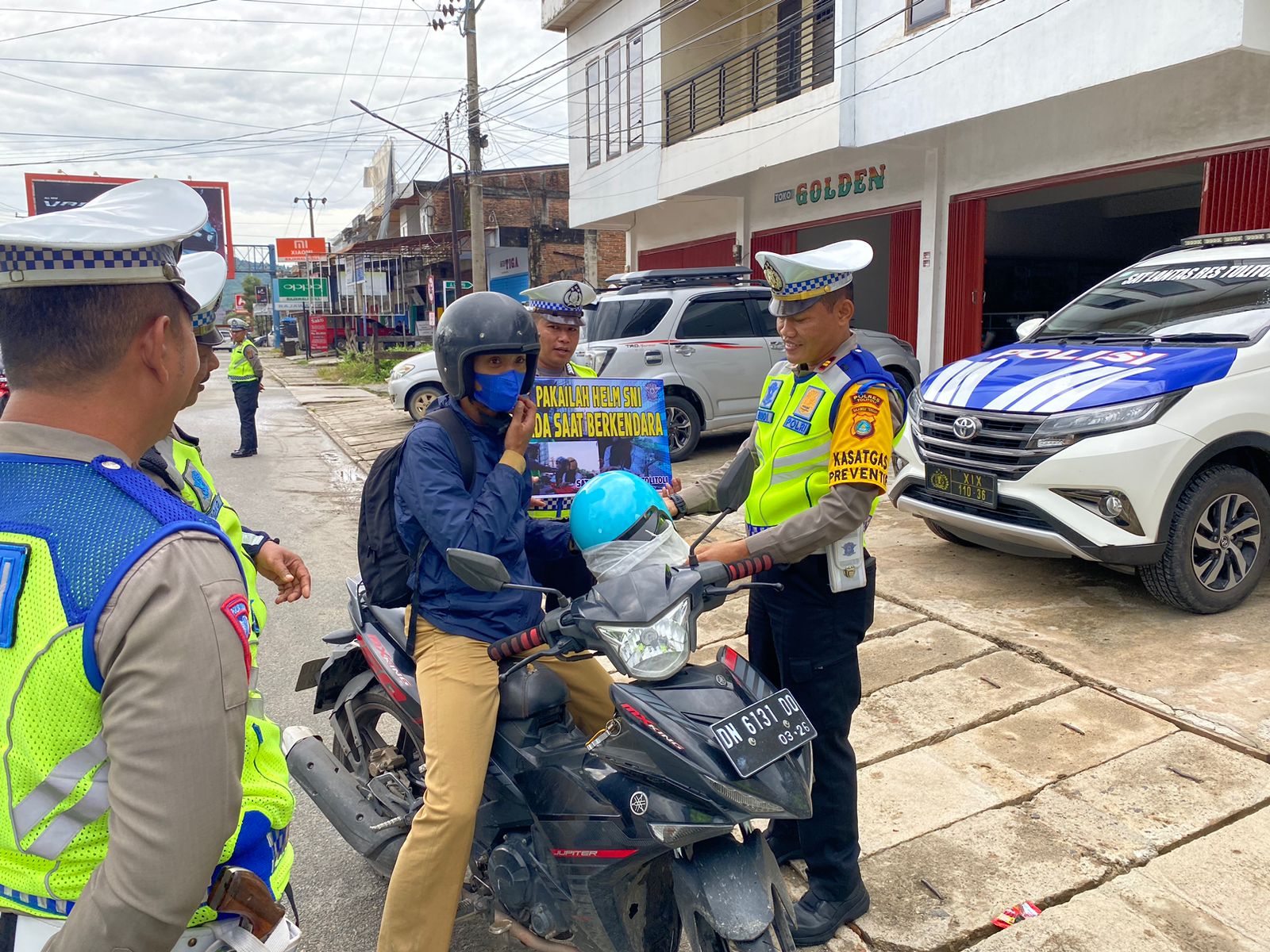 Kegiatan pembagian helm tersebut dipimpin langsung oleh Kasat Lantas Polres Tolitoli Iptu Budi Prasetyo SH.