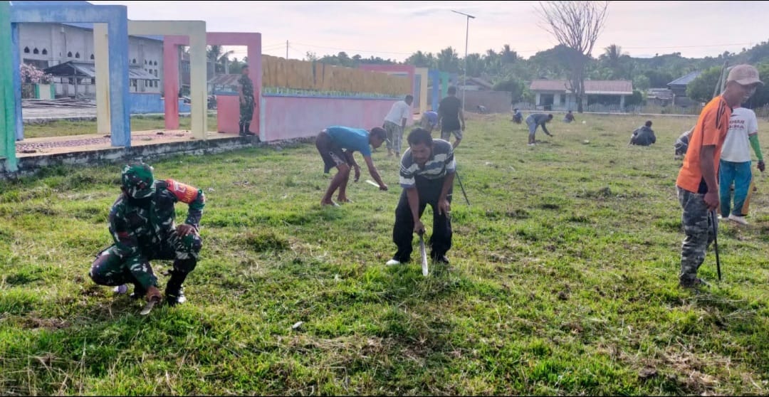 Tolitoli, Sulteng | Kabartoday.id – Memberikan contoh dan teladan yang baik kepada masyarakat untuk menjaga dan merawat sarana olah raga di desanya, anggota Babinsa Koramil 1305-02/Tolitoli Utara, Kopda Leski dan Praka jumadil mengajak warga untuk melaksanakan pembersihan lapangan sepak bola dusun beringin dan pembersihan halaman masjid, di Desa Binontoan Kecamatan Tolitoli Utara, Jum’at (26/11/2021).