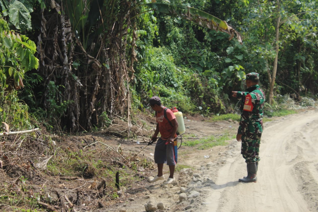 Tolitoli, Sulteng Kabartoday.id – Rumput liar di sekitar bahu jalan kantong produksi yang berada dilokasi sasaran TMMD 118 di Dusun Penyapu, Desa Galumpang Kecamatan Dakopamean, Kabupaten Tolitoli mulai di Semprot