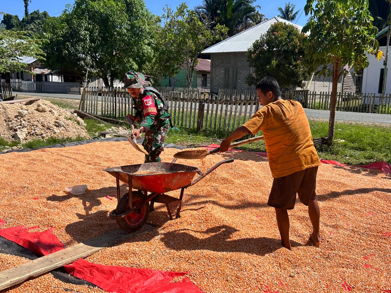 Dalam kegiatan tersebut, Pratu Harianto R Sulu terlibat langsung dalam proses penjemuran jagung milik warga setempat, Bapak Sudirman. Aktivitas ini merupakan bagian dari pembinaan ketahanan pangan (Hanpangan) yang secara konsisten digalakkan guna mendukung kesejahteraan masyarakat, khususnya para petani di wilayah binaan.