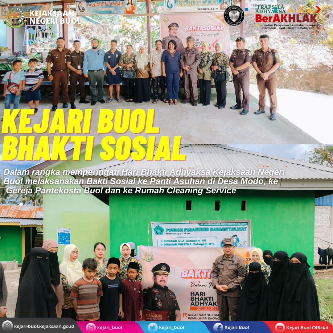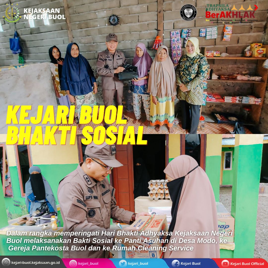 BUOL, Sulteng | Kabartoday.id – Kejaksaan Negeri (Kejari) Buol mengadakan sejumlah kegiatan bakti sosial untuk memperingati Hari Bhakti Adhyaksa ke-62 dan Hari Ulang Tahun (HUT) ke-22 Ikatan Adhyaksa Dharmakarini (IAD).