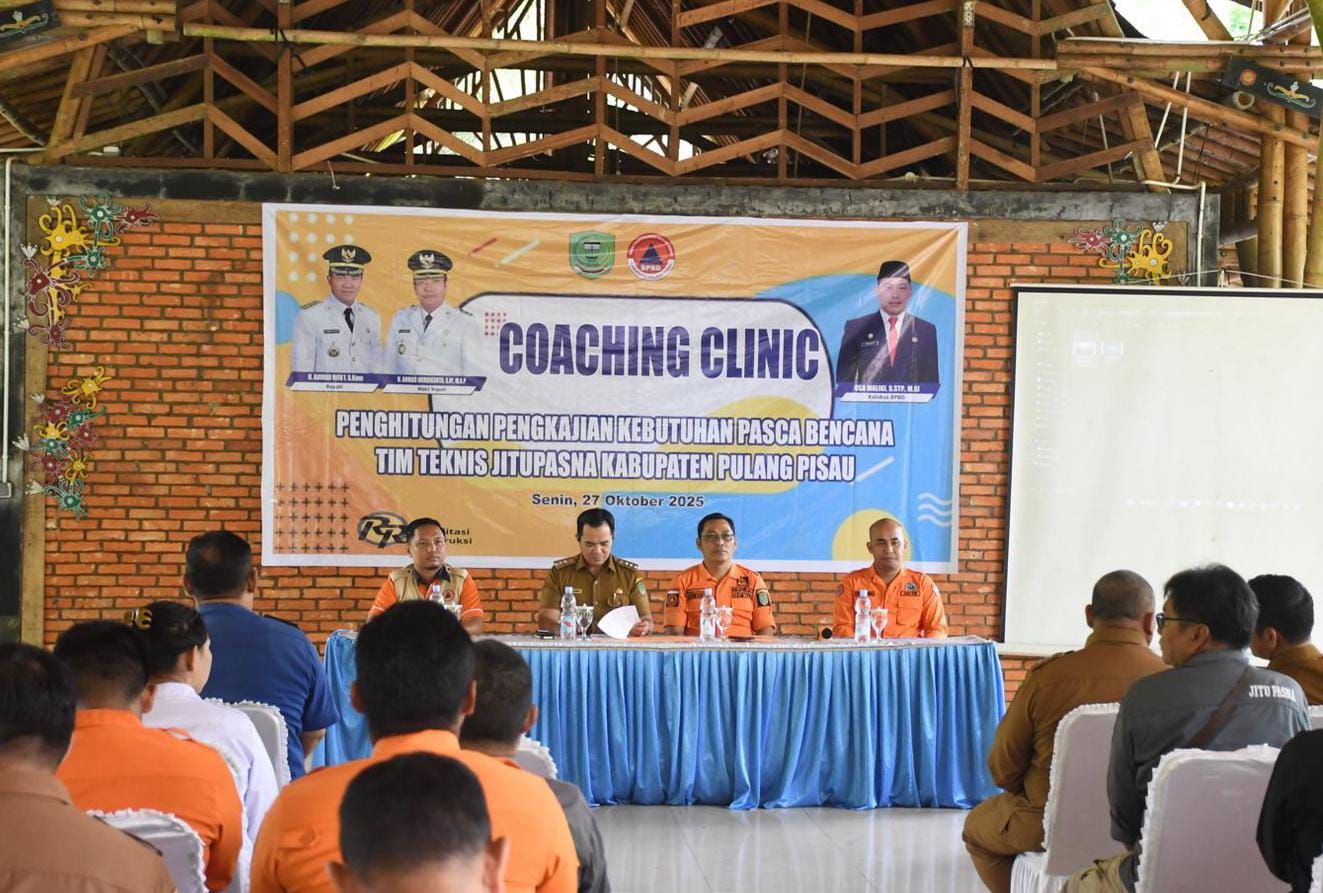 SUYANTO | PULANG PISAU | KALTENG – Bupati Pulang Pisau, H. Ahmad Rifa’i secara resmi membuka kegiatan Pelatihan Penghitungan Kajian Kebutuhan Pascabencana (Coaching Clinic) Kabupaten Pulang Pisau Tahun 2025 yang diselenggarakan oleh Badan Penanggulangan Bencana Daerah (BPBD) Kabupaten Pulang Pisau. Kegiatan berlangsung di Rumah Bambu Desa Buntoi, Kecamatan Kahayan Hilir, Senin (27/10/2025).