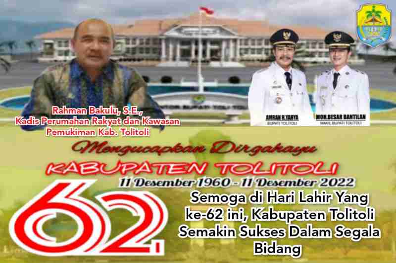 “Semoga Dengan bertambahnya usia Kabupaten Tolitoli menjadi 62 Tahun, Kabupaten Tolitoli semakin maju, Dan sukses dalam setiap bidang, “DIRGAHAYU TOLITOLI – KU YANG KE-62”