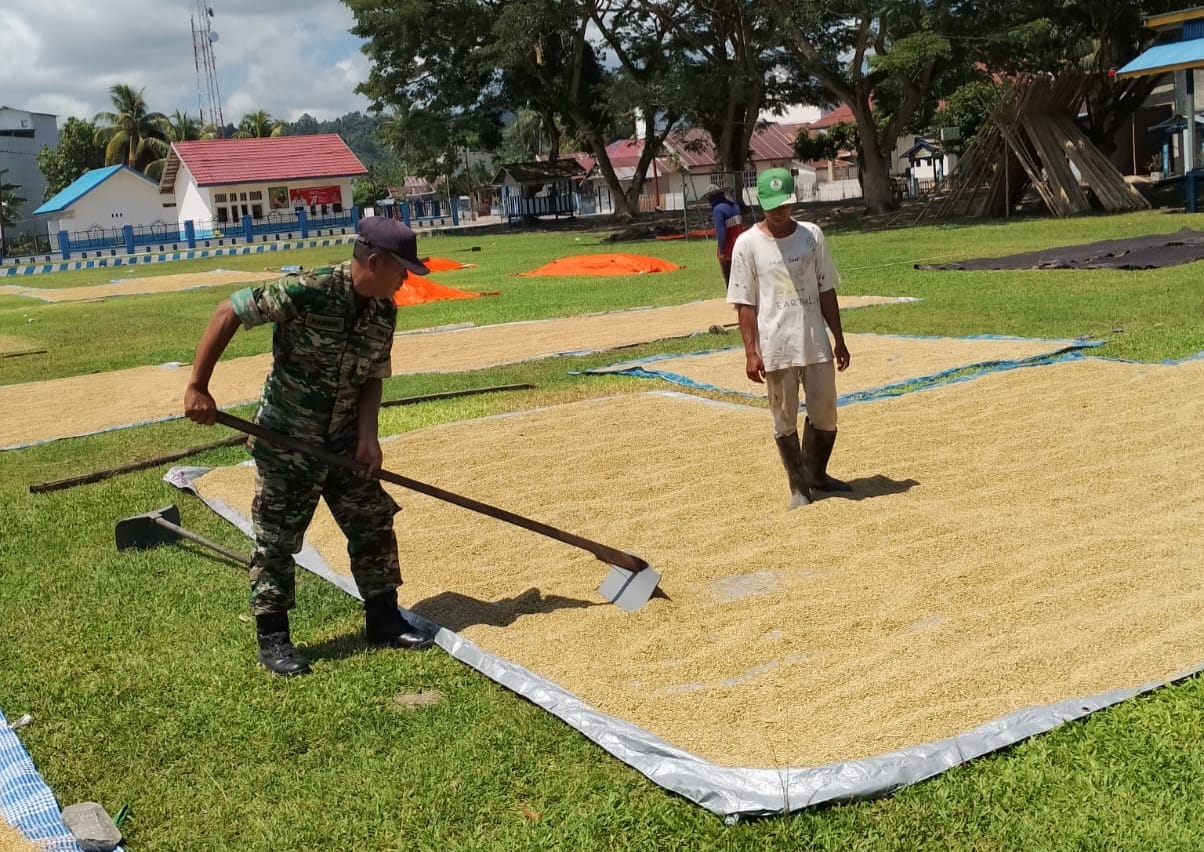 Kodim1305/BT, Sulteng | Kabartoday.id – Dalam rangka menjaga Ketahanan pangan di wilayah binaan, prajurit TNI Bintara Pembina Desa (Babinsa) turut membantu masyarakat menjemur padi.