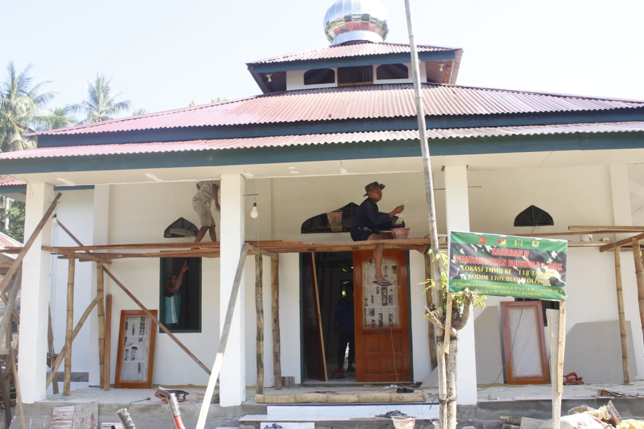 Tolitoli, Sulteng Kabartoday.id – Satuan Tugas (Satgas) TNI Manunggal Membangun Desa (TMMD) ke 118 Kodim 1305/BT kini telah masuk tahap baru untuk penyelesaian pengecetan Plafon Mushola.