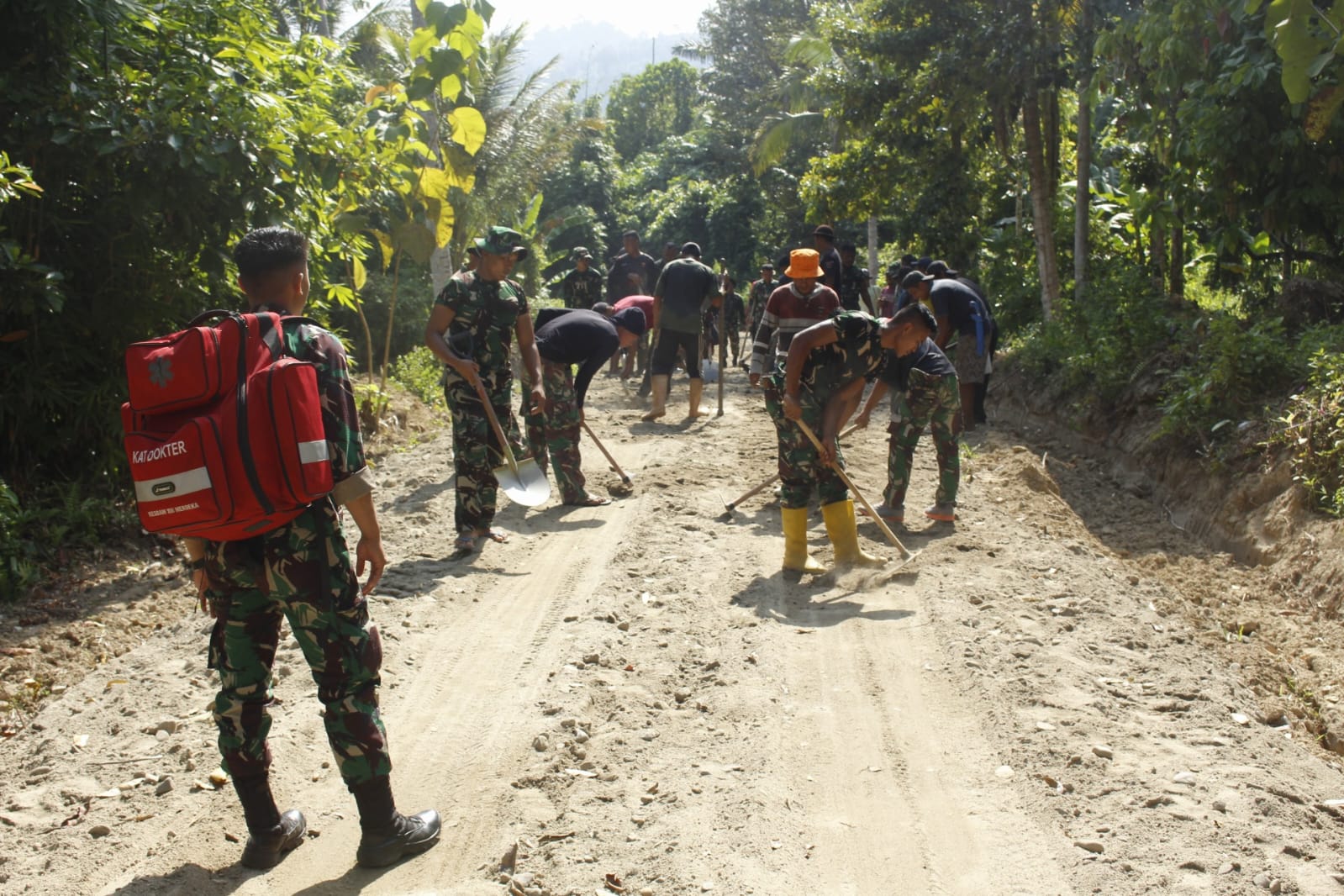 Satgas TMMD ke-118 kodim 1305/BT ini, selalu melakukan kegiatan dengan sistem gotong royong bersama Masyarakat, seperti dalam sasaran pembuatan jalan penghubung di TMMD ini, Kamis (12//10/2023).