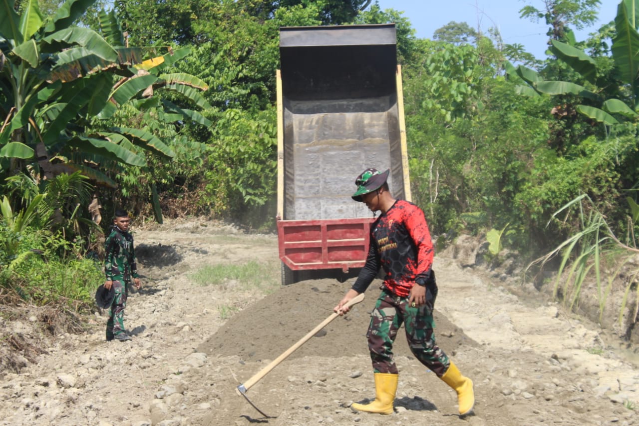Lanjutnya, Serka Toding menyampaikan, dengan penuh keyakinan ia bersama anggota satgas TMMD lainnya terlihat sedang membuka dan lihat secara langsung Dump Truk yang sedang menurunkan material.