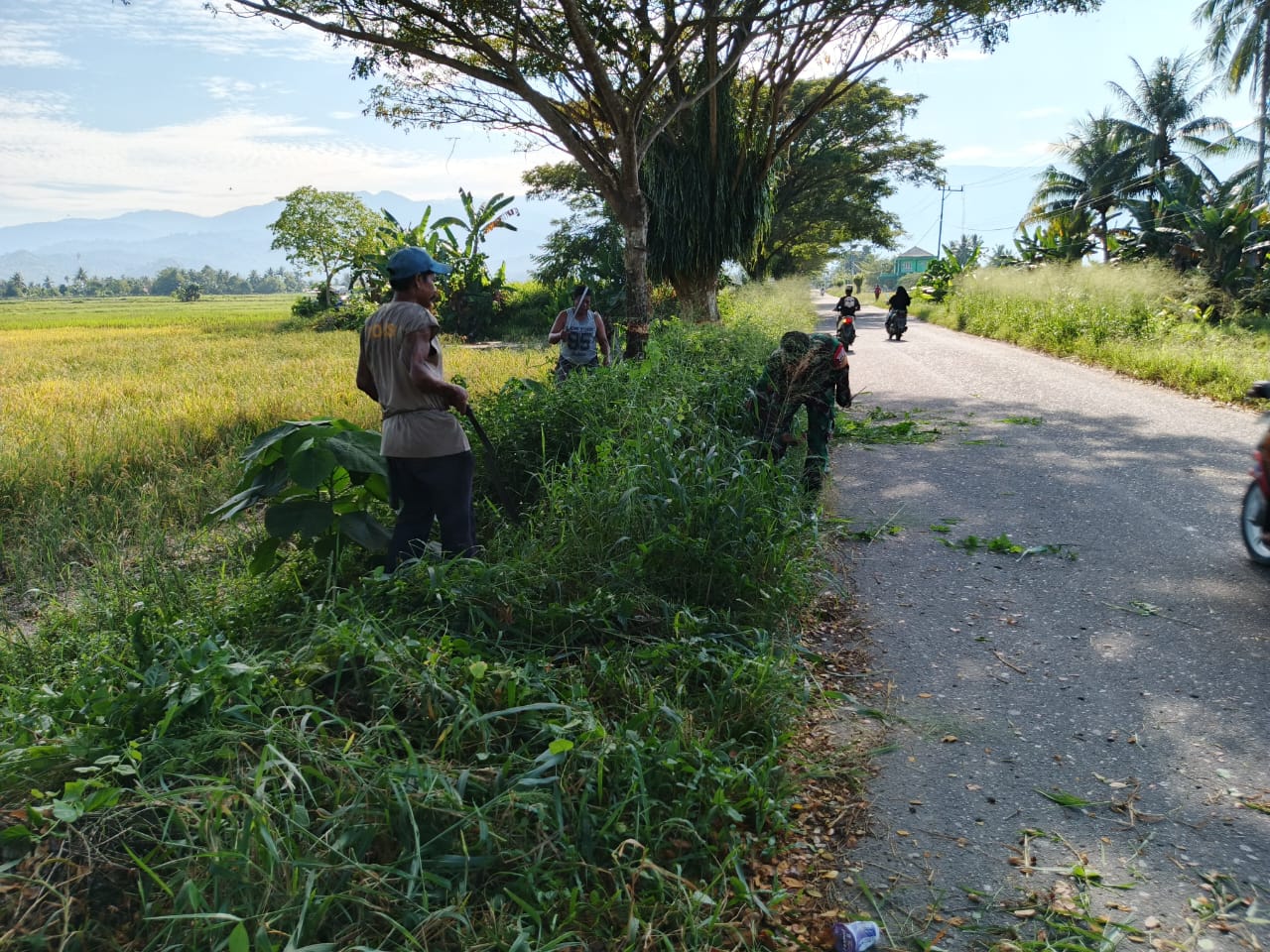 Tolitoli – Personil Koramil 1305-02/Tolit Serma Albar melaksanakan kegiatan kerja bakti Pembersihan pinggiran jalan Desa yang menghubungkan Desa Binontoan dan Desa Gio, Kec. Tolitoli utara, Kab. Tolitoli. Kamis (2/10/25)