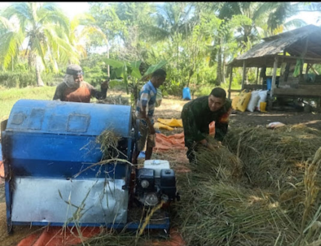 “Hari ini, ia membantu bapak Nasrin melakukan perontokan bulir padi sawah jenis mikongga,” ucap Letda Inf Suyadi.