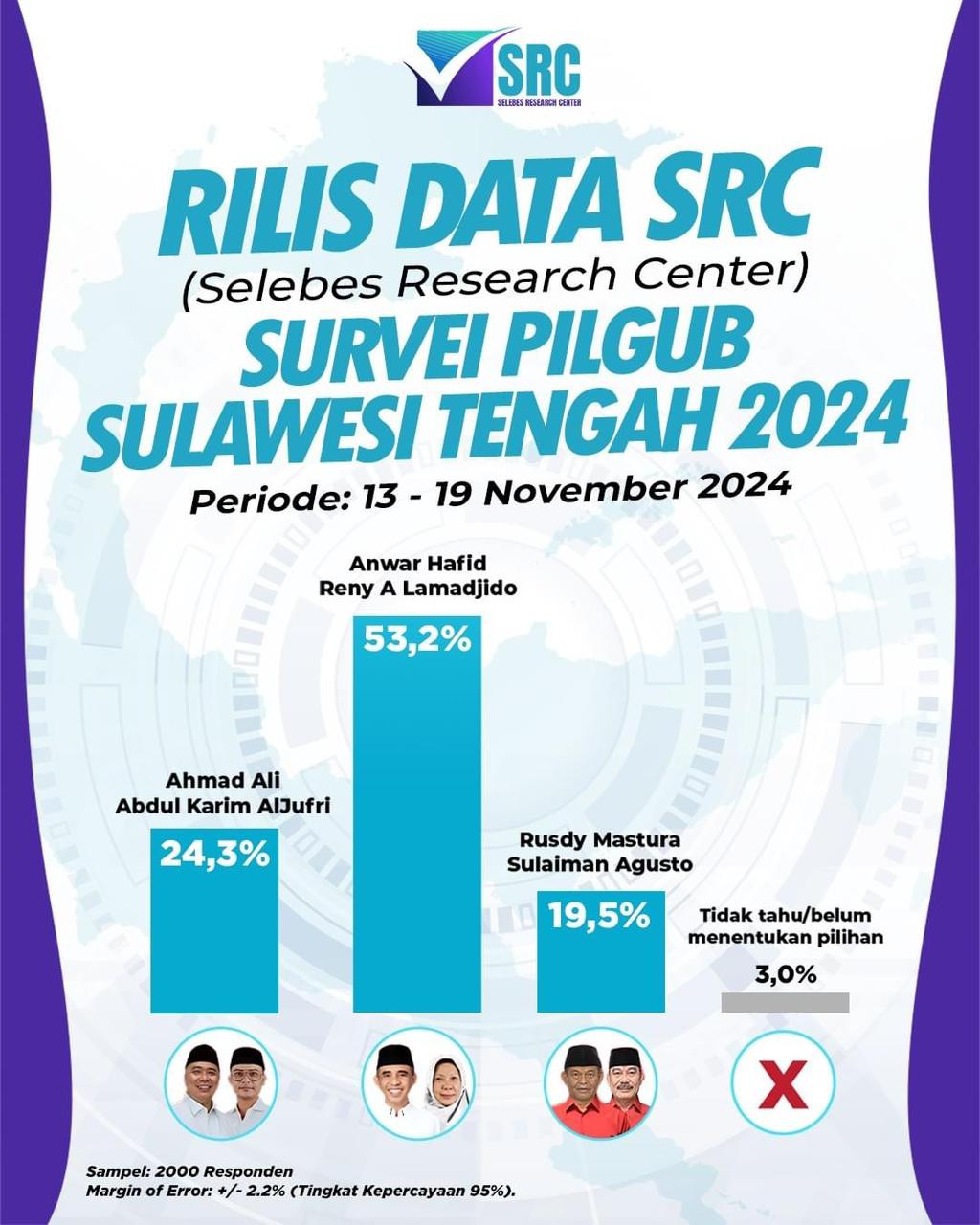 Palu, Sulteng | Kabartoday.id – Lembaga Riset dan Survei Selebes Resource Center (SRC) kembali merilis hasil survei elektabilitas calon Gubernur dan Wakil Gubernur Sulawesi Tengah 2024.